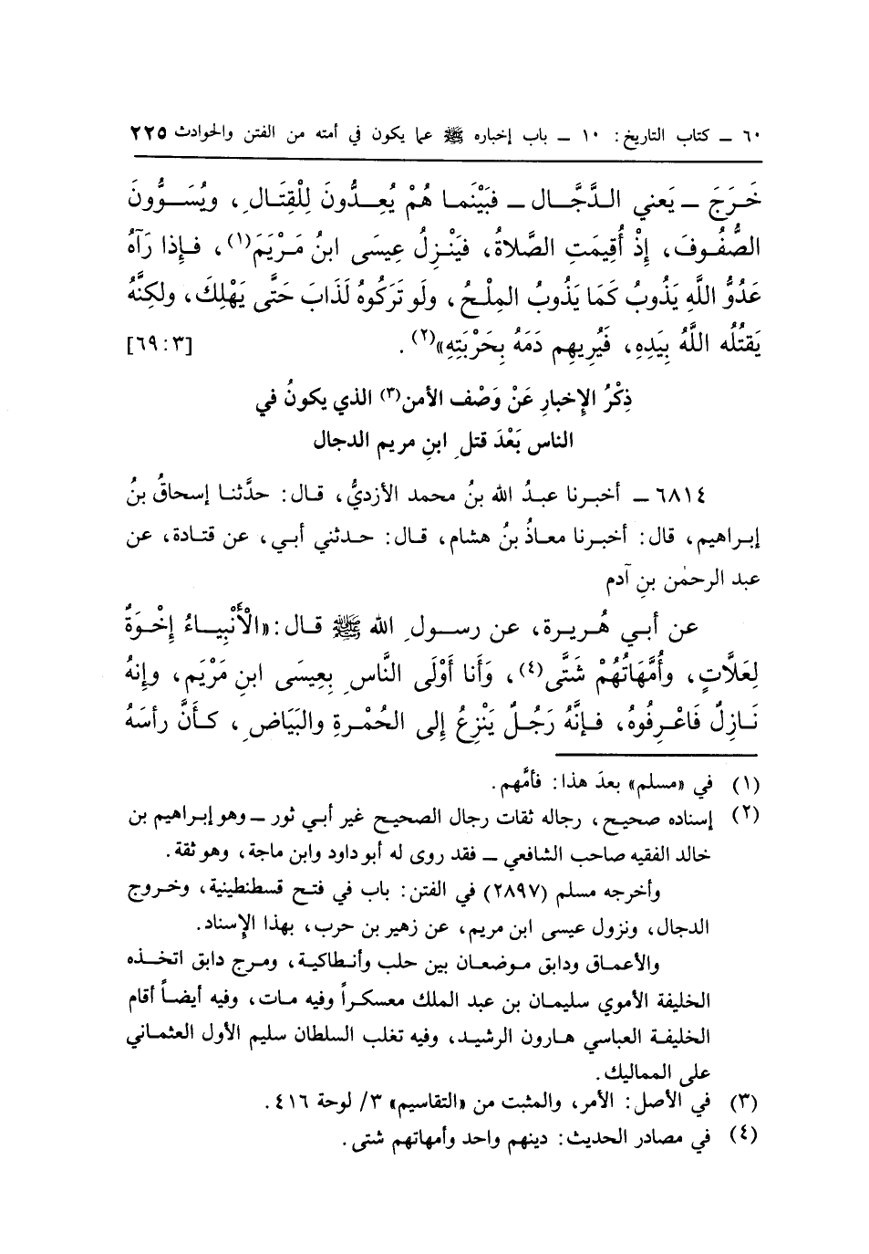 وأخرجه مسلم "2897" في الفتن: باب في فتح قسطنطينية، وخروج الدجال، ونزول عيسى ابن مريم، عن زهير بن حرب، بهذا الإسناد.