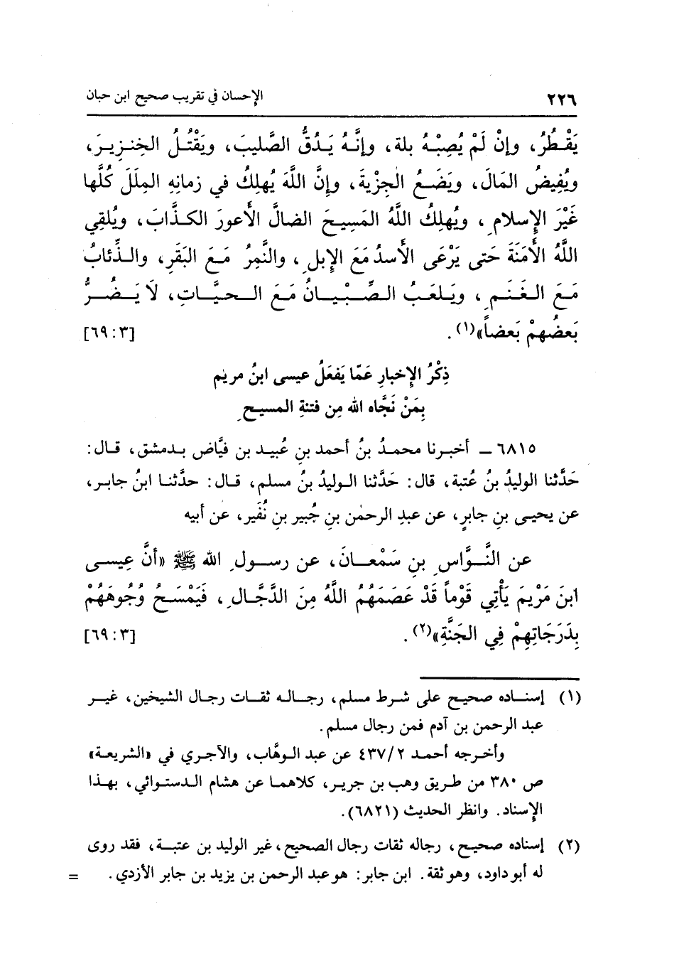 "2" إسناده صحيح، رجاله ثقات رجال الصحيح، غير الوليد بن عتبة، فقد روى له أبو داود، وهو ثقة. ابن جابر: هو عبد الرحمن بن يزيد بن جابر الأزدي وهو قطعة من حديث مطول في نزول عيسى ابن مريم وقتله الدجال.