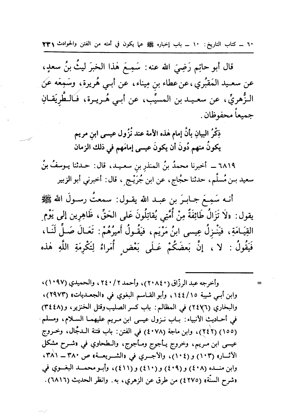 أَنَّهُ سَمِعَ جَابِرَ بْنَ عَبْدِ اللَّهِ يَقُولُ: سَمِعْتُ رَسُولَ اللَّهِ صَلَّى اللَّهُ عَلَيْهِ وَسَلَّمَ يَقُولُ: "لَا تَزَالُ طَائِفَةٌ مِنْ أُمَّتِي يُقَاتِلُونَ عَلَى الْحَقِّ، ظَاهِرِينَ إِلَى يَوْمِ الْقِيَامَةِ، فَيَنْزِلُ عِيسَى ابْنُ مَرْيَمَ، فَيَقُولُ أَمِيرُهُمْ: تَعَالَ صَلِّ لَنَا، فَيَقُولُ: لَا، إِنَّ بَعْضَكُمْ عَلَى بَعْضٍ أُمَرَاءُ لِتَكْرِمَةِ الله هذه الأمة" "1". [3: 69]