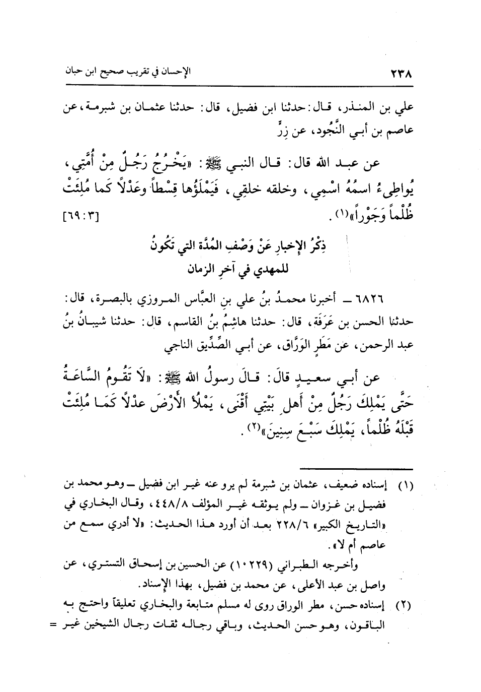 عَنْ عَبْدِ اللَّهِ قَالَ: قَالَ النَّبِيُّ صَلَّى اللَّهُ عَلَيْهِ وَسَلَّمَ: "يخرج رجل من أمتي، يواطىء اسْمُهُ اسْمِي، وَخُلُقُهُ خُلُقِي، فَيَمْلَؤُهَا قِسْطًا وَعَدْلًا كما ملئت ظلما وجورا" "1". [3: 69]