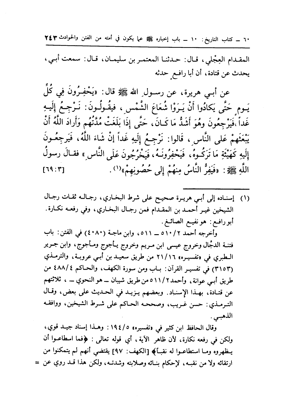 الْمِقْدَامِ الْعِجْلِيُّ، قَالَ: حَدَّثَنَا الْمُعْتَمِرُ بْنُ سُلَيْمَانَ، قَالَ: سَمِعْتُ أَبِي، يُحَدِّثُ عَنْ قَتَادَةَ، أَنَّ أَبَا رَافِعٍ حَدَّثَهُ، عَنْ أَبِي هُرَيْرَةَ، عَنْ رَسُولِ اللَّهِ صَلَّى الله عليه وسلم قال: "يَحْفِرُونَ فِي كُلِّ يَوْمٍ حَتَّى يَكَادُوا أَنْ يَرَوْا شُعَاعَ الشَّمْسِ، فَيَقُولُونَ: نَرْجِعُ إِلَيْهِ غَدًا، فَيَرْجِعُونَ وَهُوَ أَشَدُّ مَا كَانَ، حَتَّى إِذَا بَلَغَتْ مُدَّتُهُمْ وَأَرَادَ اللَّهُ أَنْ يَبْعَثَهُمْ عَلَى النَّاسِ، قَالُوا: نَرْجِعُ إِلَيْهِ غَدًا إِنْ شَاءَ اللَّهُ، فَيَرْجِعُونَ إِلَيْهِ كَهَيْئَةِ مَا تَرَكُوهُ، فَيَحْفِرُونَهُ، فَيَخْرُجُونَ عَلَى النَّاسِ" فَقَالَ رَسُولُ اللَّهِ صَلَّى اللَّهُ عَلَيْهِ وَسَلَّمَ: "فَيَفِرُّ النَّاسُ مِنْهُمْ إِلَى حصونهم" "1". [3: 69]