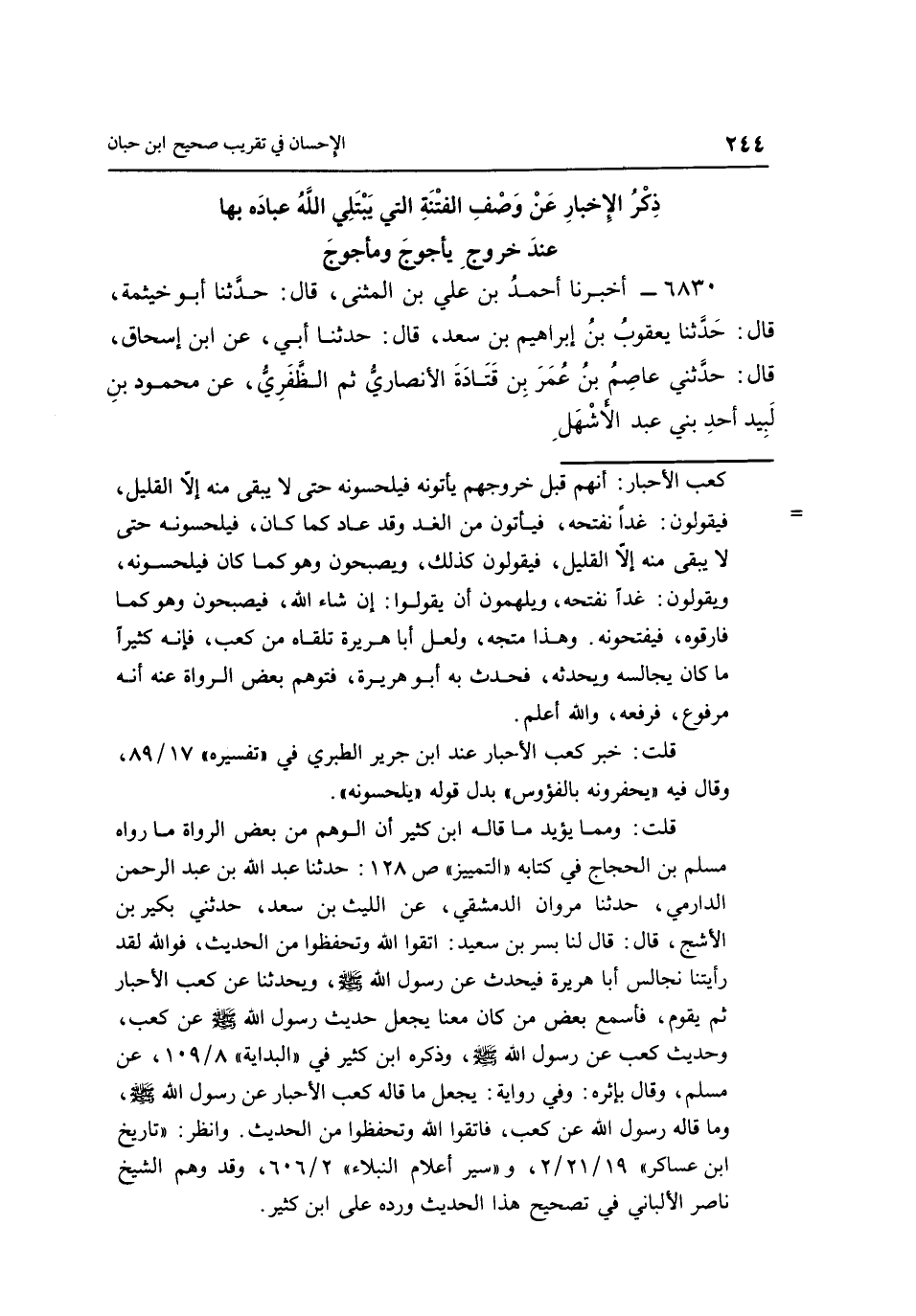 6830 - أَخْبَرَنَا أَحْمَدُ بْنُ عَلِيِّ بْنِ الْمُثَنَّى، قَالَ: حَدَّثَنَا أَبُو خَيْثَمَةَ، قَالَ: حَدَّثَنَا يَعْقُوبُ بْنُ إِبْرَاهِيمَ بْنِ سَعْدٍ، قَالَ: حَدَّثَنَا أَبِي، عَنِ ابْنِ إِسْحَاقَ، قَالَ: حَدَّثَنِي عَاصِمُ بْنُ عُمَرَ بْنِ قَتَادَةَ الْأَنْصَارِيُّ ثُمَّ الظَّفَرِيُّ، عَنْ مَحْمُودِ بن لبيد أحد بني عبد الأشهلذكر الْإِخْبَارِ عَنْ وَصْفِ الْفِتْنَةِ الَّتِي يَبْتَلِي اللَّهُ عِبَادَهُ بِهَا عِنْدَ خُرُوجِ يَأْجُوجَ وَمَأْجُوجَ