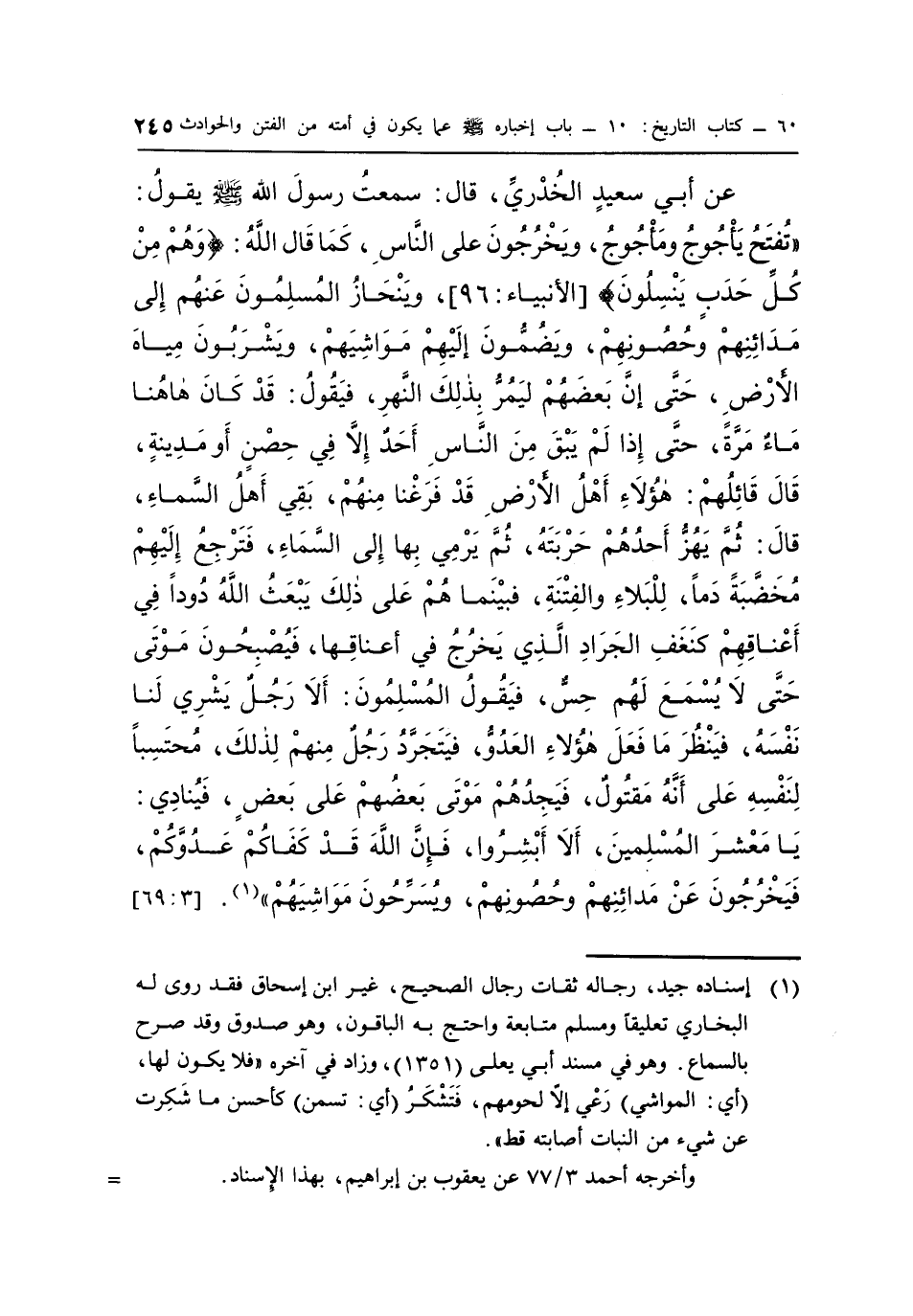 عَنْ أَبِي سَعِيدٍ الْخُدْرِيِّ، قَالَ: سَمِعْتُ رَسُولَ اللَّهِ صَلَّى اللَّهُ عَلَيْهِ وَسَلَّمَ يَقُولُ: "تُفْتَحُ يَأْجُوجُ وَمَأْجُوجُ، وَيَخْرُجُونَ عَلَى النَّاسِ" كَمَا قَالَ اللَّهُ: {وَهُمْ مِنْ كُلِّ حَدَبٍ يَنْسِلُونَ} [الأنبياء:96] وَيَنْحَازُ الْمُسْلِمُونَ عَنْهُمْ إِلَى مَدَائِنِهِمْ وَحُصُونِهِمْ، وَيَضُمُّونَ إِلَيْهِمْ مَوَاشِيَهُمْ، وَيَشْرَبُونَ مِيَاهَ الْأَرْضِ، حَتَّى إِنَّ بَعْضَهُمْ لَيَمُرُّ بِذَلِكَ النَّهْرِ، فَيَقُولُ: قَدْ كَانَ هَاهُنَا مَاءٌ مَرَّةً، حَتَّى إِذَا لَمْ يَبْقَ مِنَ النَّاسِ أَحَدٌ إِلَّا فِي حِصْنٍ أَوْ مَدِينَةٍ، قَالَ قَائِلُهُمْ: هَؤُلَاءِ أَهْلُ الْأَرْضِ قَدْ فَرَغْنَا مِنْهُمْ، بَقِيَ أَهْلُ السَّمَاءِ، قَالَ: ثُمَّ يَهُزُّ أَحَدُهُمْ حَرْبَتَهُ، ثُمَّ يَرْمِي بِهَا إِلَى السَّمَاءِ، فَتَرْجِعُ إِلَيْهِمْ مُخَضَّبَةً دَمًا، لِلْبَلَاءِ وَالْفِتْنَةِ، فَبَيْنَمَا هُمْ عَلَى ذَلِكَ يَبْعَثُ اللَّهُ دُودًا فِي أَعْنَاقِهِمْ كَنَغَفِ الْجَرَادِ الَّذِي يَخْرُجُ فِي أعناقها، فَيُصْبِحُونَ مَوْتَى حَتَّى لَا يُسْمَعَ لَهُمْ حِسٌّ، فَيَقُولُ الْمُسْلِمُونَ: أَلَا رَجُلٌ يَشْرِي لَنَا نَفْسَهُ، فَيَنْظُرُ مَا فَعَلَ هَؤُلَاءِ الْعَدُوُّ، فَيَتَجَرَّدُ رَجُلٌ منهم لذلك، محتسبا لنفسه على أن مَقْتُولٌ، فَيَجِدُهُمْ مَوْتَى بَعْضُهُمْ عَلَى بَعْضٍ، فَيُنَادِي يَا مَعْشَرَ الْمُسْلِمِينَ، أَلَا أَبْشِرُوا، فَإِنَّ اللَّهَ قَدْ كَفَاكُمْ عَدُوَّكُمْ، فَيَخْرُجُونَ عَنْ مَدَائِنِهِمْ وَحُصُونِهِمْ، ويسرحون مواشيهم" " 1". [3: 69]