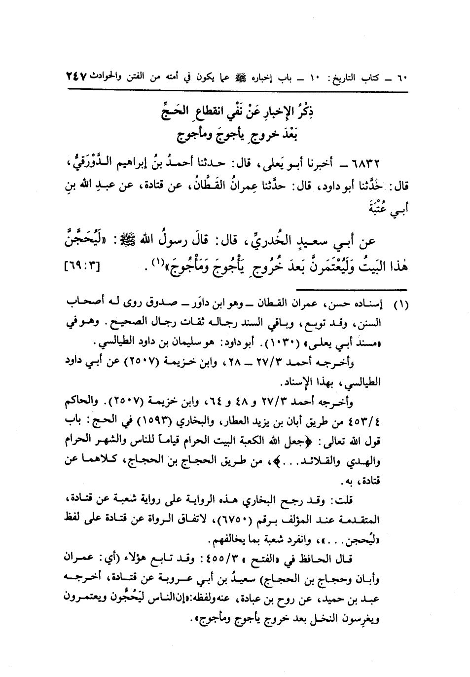 عَنْ أَبِي سَعِيدٍ الْخُدْرِيِّ، قَالَ: قَالَ رَسُولُ اللَّهِ صَلَّى اللَّهُ عَلَيْهِ وَسَلَّمَ: "لَيُحَجَّنَّ هَذَا البيت وليعتمرن بعد خرج يأجوج ومأجوج" "1". [3: 69]