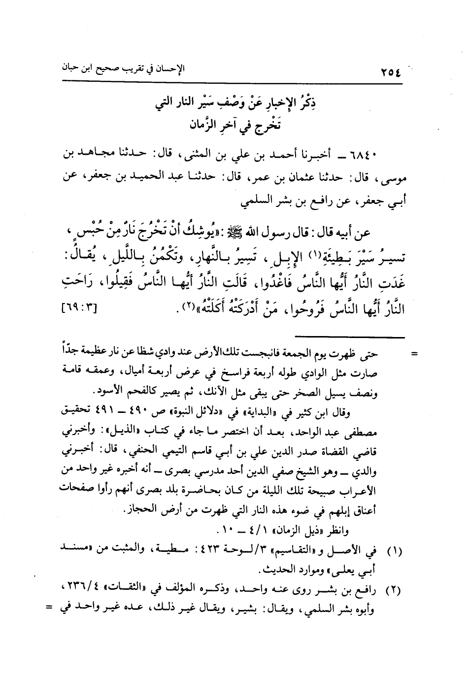 وقال ابن كثير في "البداية" في "دلائل النبوة" ص 490 - 491 تحقيق مصطفى عبد الواحد، بعد أن اختصر ما جاء في كتاب "الذيل": وأخبرني والدي – وهو الشيخ صفي الدين أحد مدرسي بصرى - أنه أخبره غير واحد من الأعراب صبيحة تلك الليلة من كان بحاضرة بلد بصرى أنهم رأوا صفحات أعناق إبلهم في ضوء هذه النار التي ظهرت من أرض الحجاز.