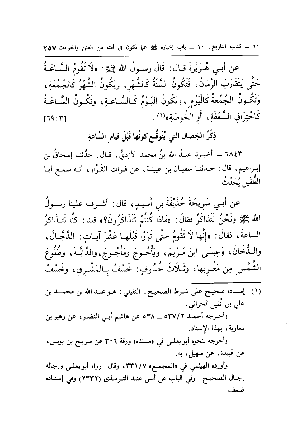 عَنْ أَبِي هُرَيْرَةَ قَالَ: قَالَ رَسُولُ اللَّهِ صَلَّى اللَّهُ عَلَيْهِ وَسَلَّمَ: "لَا تَقُومُ السَّاعَةُ حَتَّى يَتَقَارَبَ الزَّمَانُ، فَتَكُونُ السَّنَةُ كَالشَّهْرِ، وَيَكُونُ الشَّهْرُ كَالْجُمُعَةِ، وَتَكُونُ الْجُمُعَةُ كَالْيَوْمِ، وَيَكُونُ الْيَوْمُ كَالسَّاعَةِ، وَتَكُونُ السَّاعَةُ كَاحْتِرَاقِ السَّعَفَةِ، أَوِ الْخُوصَةِ" "1". [3: 69]