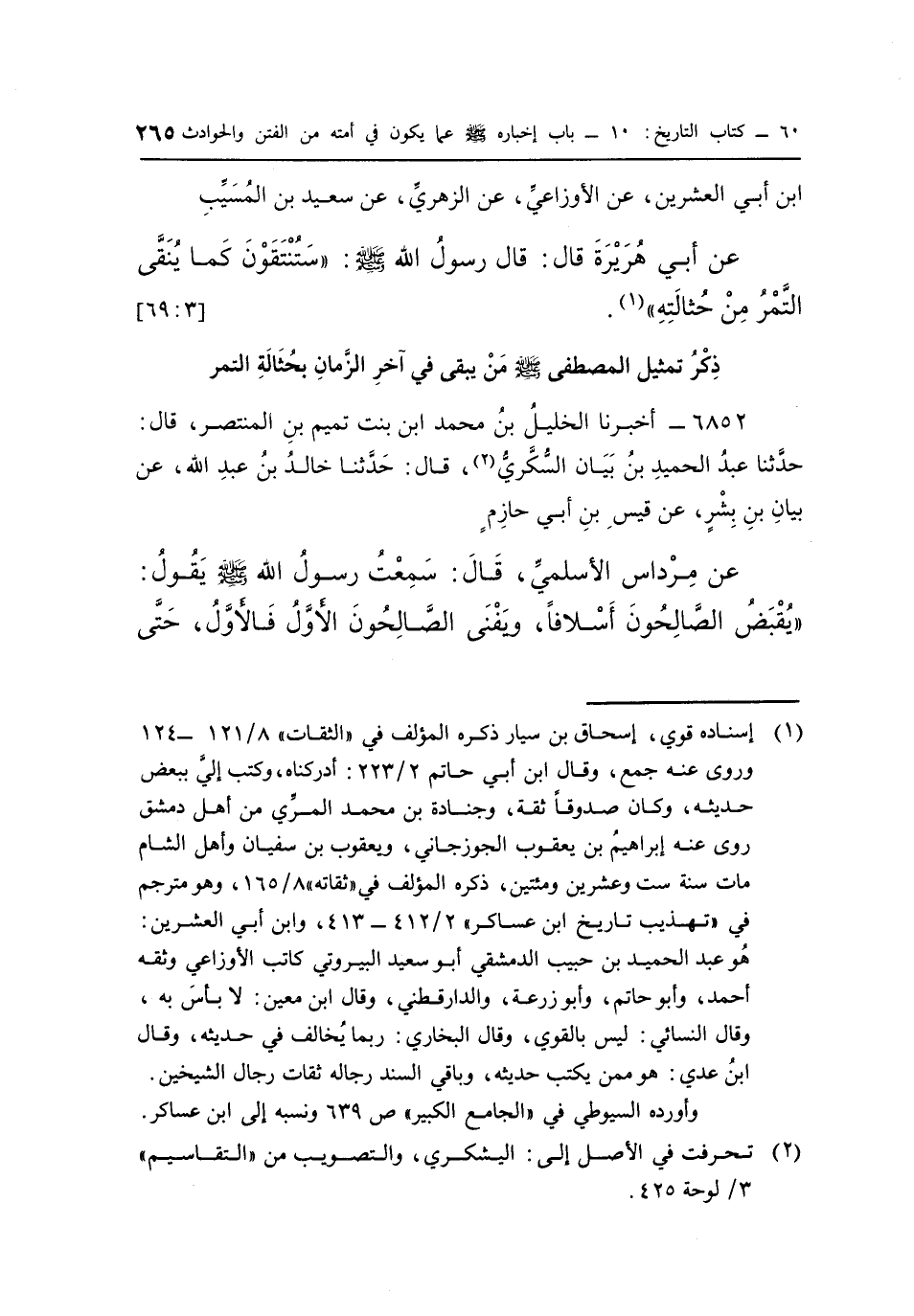 عَنْ مِرْدَاسٍ الْأَسْلَمِيِّ، قَالَ: سَمِعْتُ رَسُولَ اللَّهِ صَلَّى اللَّهُ عَلَيْهِ وَسَلَّمَ يَقُولُ: "يُقْبَضُ الصَّالِحُونَ أَسْلَافًا، وَيَفْنَى الصالحون الأول فالأول، حتى