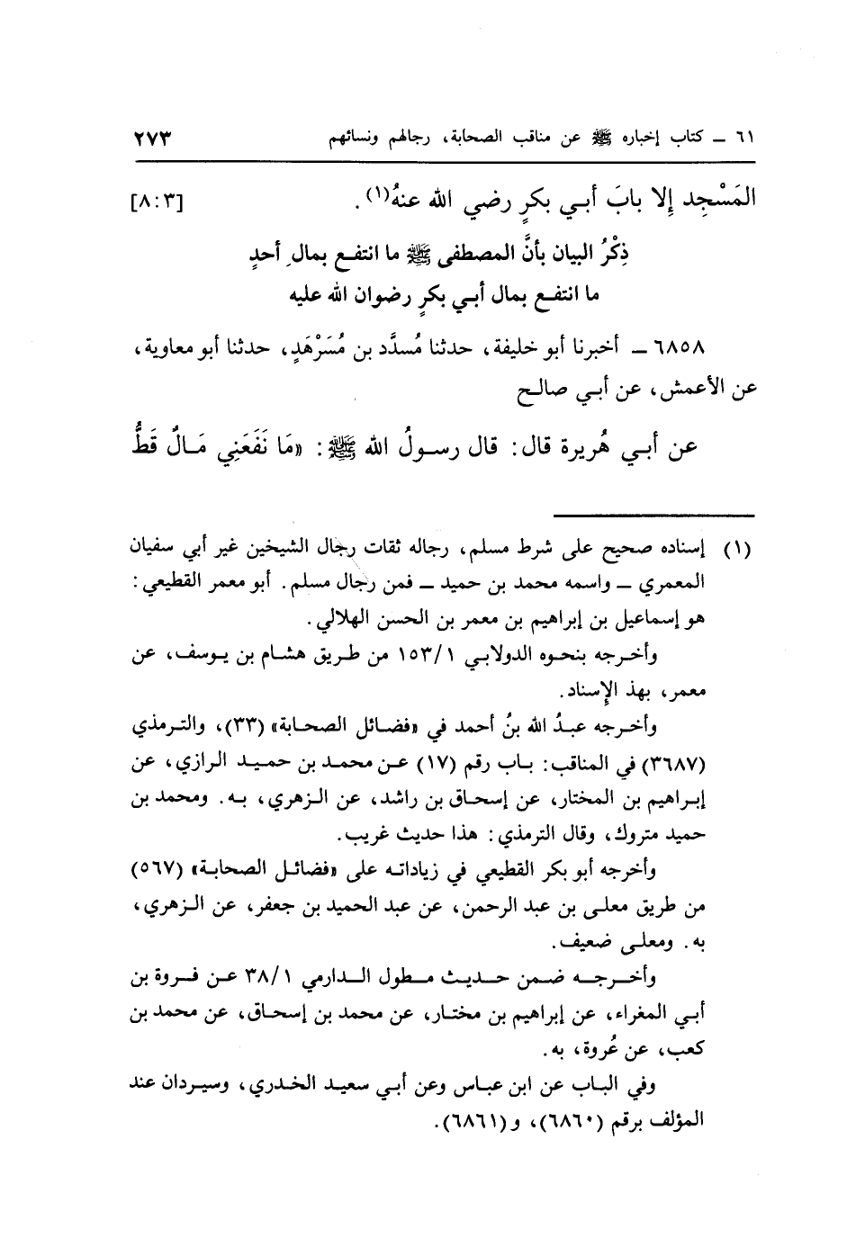 "1" إسناده صحيح على شرط مسلم، رجاله ثقات رجال الشيخين غير أبي سفيان المعمري - واسمه محمد بن حميد - فمن رجال مسلم. أبو معمر القطيعي: هو إسماعيل بن إبراهيم بن معمر بن الحسن الهلالي.