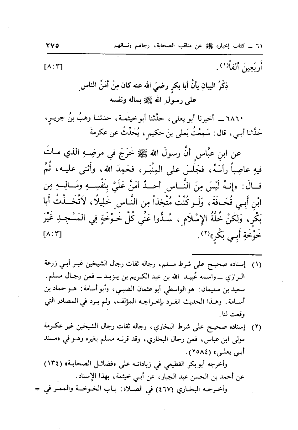 عَنِ ابْنِ عَبَّاسٍ أَنَّ رَسُولَ اللَّهِ صَلَّى اللَّهُ عَلَيْهِ وَسَلَّمَ خَرَجَ فِي مَرَضِهِ الَّذِي مَاتَ فِيهِ عَاصِبًا رَأْسَهُ، فَجَلَسَ عَلَى الْمِنْبَرِ، فَحَمِدَ اللَّهَ، وَأَثْنَى عَلَيْهِ، ثُمَّ قَالَ: "إِنَّهُ لَيْسَ مِنَ النَّاسِ أَحَدٌ أَمَنَّ عَلَيَّ بِنَفْسِهِ وَمَالِهِ مِنِ ابْنِ أَبِي قُحَافَةَ، وَلَوْ كُنْتُ مُتَّخِذًا مِنَ النَّاسِ خَلِيلًا، لَاتَّخَذْتُ أَبَا بَكْرٍ، وَلَكِنْ خُلَّةُ الْإِسْلَامِ، سُدُّوا عَنِّي كُلَّ خَوْخَةٍ فِي المسجد غير خوخة أبي بكر" "2". [3: 8]
