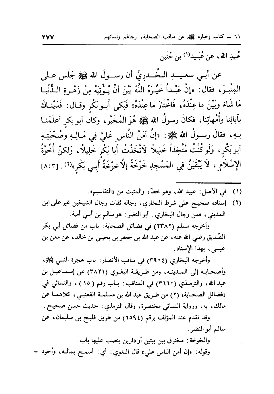 عَنْ أَبِي سَعِيدٍ الْخُدْرِيِّ أَنَّ رَسُولَ اللَّهِ صَلَّى اللَّهُ عَلَيْهِ وَسَلَّمَ جَلَسَ عَلَى الْمِنْبَرِ، فَقَالَ: "إِنَّ عَبْدًا خَيَّرَهُ اللَّهُ بَيْنَ أَنْ يُؤْتِيَهُ مِنْ زَهْرَةِ الدُّنْيَا مَا شَاءَ وَبَيْنَ مَا عِنْدَهُ، فَاخْتَارَ مَا عِنْدَهُ" فَبَكَى أَبُو بَكْرٍ وَقَالَ: فَدَيْنَاكَ بِآبَائِنَا وَأُمَّهَاتِنَا، فَكَانَ رَسُولُ اللَّهِ صَلَّى اللَّهُ عَلَيْهِ وَسَلَّمَ هُوَ الْمُخَيَّرُ، وَكَانَ أَبُو بَكْرٍ أَعْلَمَنَا بِهِ، فَقَالَ رَسُولُ اللَّهِ صَلَّى اللَّهُ عَلَيْهِ وَسَلَّمَ: "إِنَّ أَمَنَّ النَّاسِ عَلَيَّ فِي مَالِهِ وَصَحِبْتِهِ أَبُو بَكْرٍ، وَلَوْ كُنْتُ مُتَّخِذًا خَلِيلًا لَاتَّخَذْتُ أَبَا بَكْرٍ خَلِيلًا، وَلَكِنْ أُخُوَّةُ الْإِسْلَامِ، لَا يَبْقِيَنَّ فِي الْمَسْجِدِ خوخة إلا خوخة أبي بكر" "2". [3: 8]