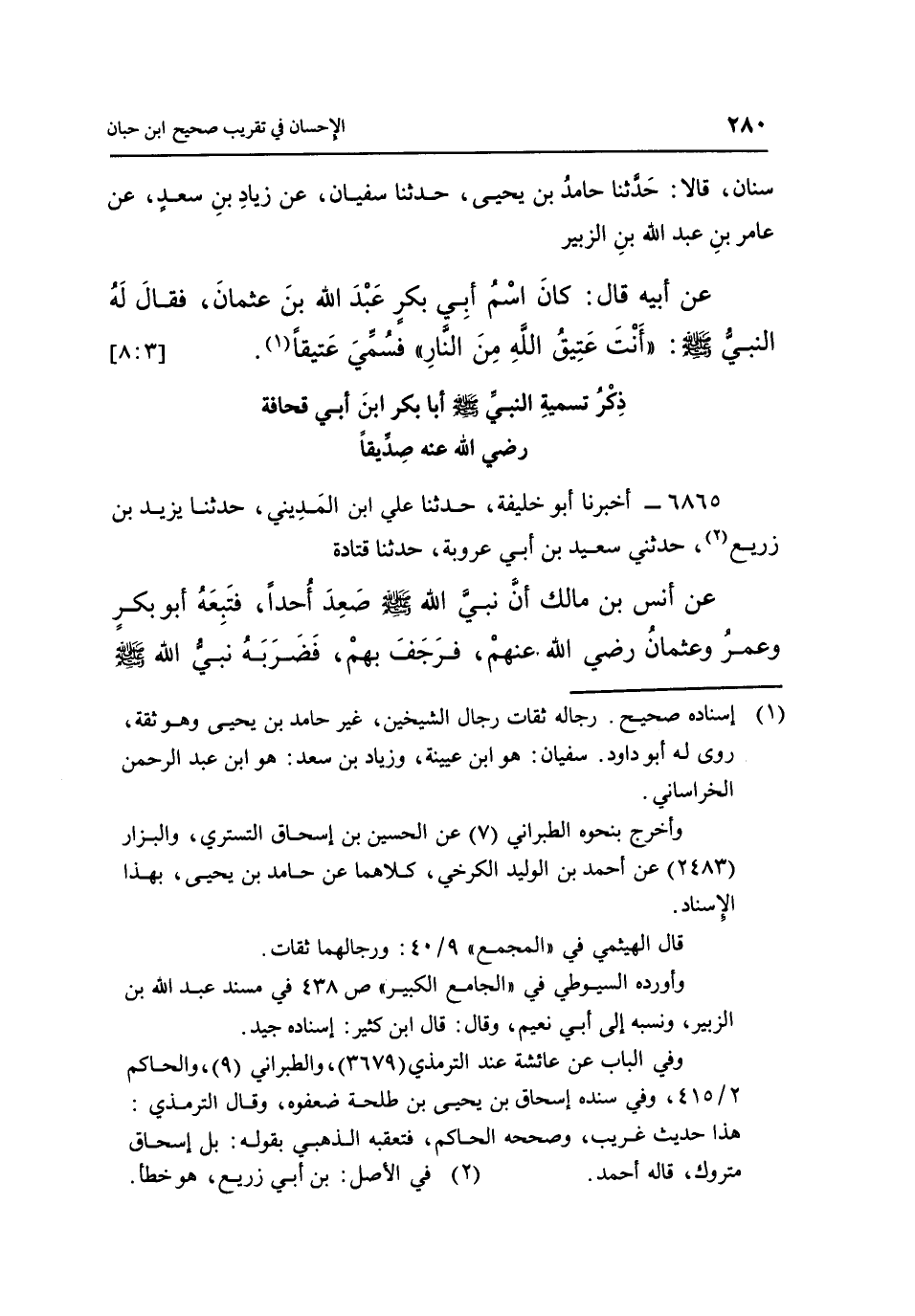 سِنَانٍ، قَالَا: حَدَّثَنَا حَامِدُ بْنُ يَحْيَى، حَدَّثَنَا سُفْيَانُ، عَنْ زِيَادِ بْنِ سَعْدٍ، عَنْ عَامِرِ بْنِ عَبْدِ اللَّهِ بْنِ الزُّبَيْرِ، عَنْ أَبِيهِ قَالَ: كَانَ اسْمُ أَبِي بَكْرٍ عَبْدَ اللَّهِ بْنَ عُثْمَانَ، فَقَالَ لَهُ النَّبِيُّ صَلَّى اللَّهُ عَلَيْهِ وَسَلَّمَ: "أَنْتَ عَتِيقُ اللَّهِ مِنَ النَّارِ" فسمي عتيقا"1 [3: 8]