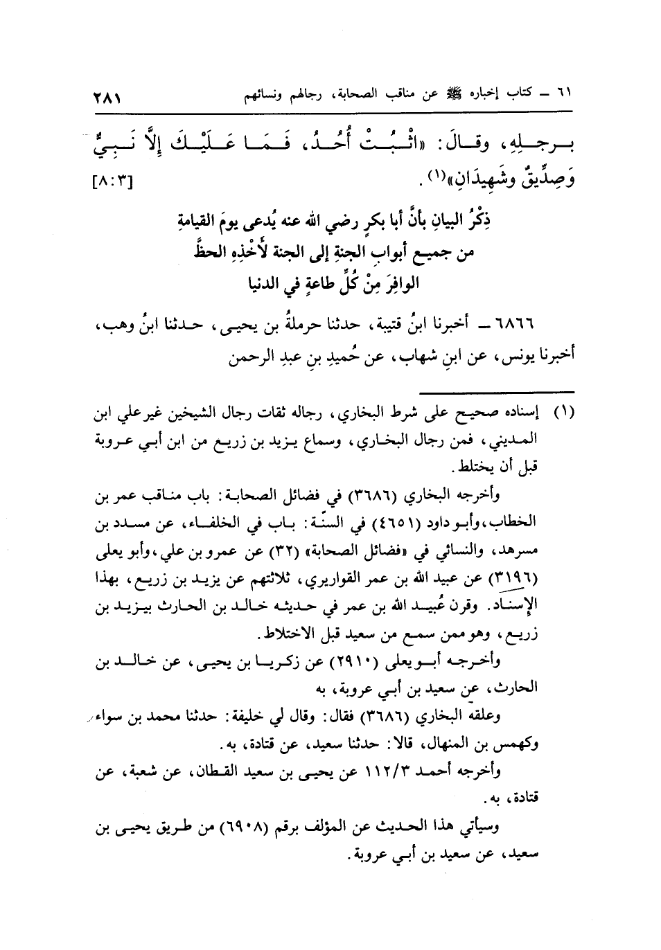 6866 - أخبرنا بْنِ قُتَيْبَةَ، حَدَّثَنَا حَرْمَلَةُ بْنُ يَحْيَى، حَدَّثَنَا بن وهب، أخبرنا يونس، عن بن شهاب، عن حميد بن عبد الرحمنذكر الْبَيَانِ بِأَنَّ أَبَا بَكْرٍ رَضِيَ اللَّهُ عَنْهُ يُدْعَى يَوْمَ الْقِيَامَةِ مِنْ جَمِيعِ أَبْوَابِ الْجَنَّةِ إِلَى الْجَنَّةِ لِأَخْذِهِ الْحَظَّ الْوَافِرَ مِنْ كُلِّ طاعة في الدنيا