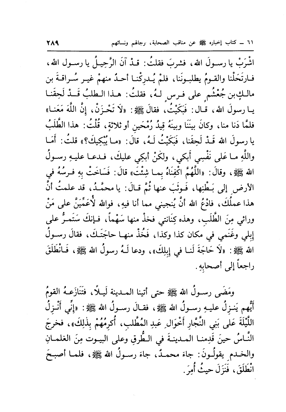 اشْرَبْ يَا رَسُولَ اللَّهِ، فَشَرِبَ فَقُلْتُ: قَدْ آنَ الرَّحِيلُ يَا رَسُولَ اللَّهِ، فَارْتَحَلْنَا وَالْقَوْمُ يَطْلُبُونَنَا، فَلَمْ يُدْرِكْنَا أَحَدٌ مِنْهُمْ غَيْرُ سُرَاقَةِ بْنِ مَالِكِ بْنِ جُعْشُمٍ عَلَى فَرَسٍ لَهُ، فَقُلْتُ: هَذَا الطَّلَبُ قَدْ لَحِقَنَا يَا رَسُولَ اللَّهِ، قَالَ: فَبَكَيْتُ، فَقَالَ صَلَّى اللَّهُ عَلَيْهِ وَسَلَّمَ: "لَا تَحْزَنْ، إِنَّ اللَّهَ مَعَنَا" فَلَمَّا دَنَا مِنَّا، وَكَانَ بَيْنَنَا وَبَيْنَهُ قِيدُ رُمْحَيْنِ أَوْ ثَلَاثَةٍ، قُلْتُ: هَذَا الطَّلَبُ يَا رَسُولَ اللَّهِ قَدْ لَحِقَنَا، فَبَكَيْتُ لَهُ، قَالَ: "مَا يُبْكِيكَ؟ " قُلْتُ: أَمَا وَاللَّهِ مَا عَلَى نَفْسِي أَبْكِي، وَلَكِنْ أَبْكِي عَلَيْكَ، فَدَعَا عَلَيْهِ رَسُولُ اللَّهِ صَلَّى اللَّهُ عَلَيْهِ وَسَلَّمَ، وَقَالَ: "اللَّهُمَّ اكْفِنَاهُ بِمَا شِئْتَ" قَالَ: فَسَاخَتْ بِهِ فَرَسُهُ فِي الْأَرْضِ إِلَى بَطْنِهَا، فَوَثَبَ عَنْهَا ثُمَّ قَالَ: يَا مُحَمَّدُ، قَدْ عَلِمْتُ أَنَّ هَذَا عَمَلُكَ، فَادْعُ اللَّهَ أَنْ يُنَجِّينِي مِمَّا أَنَا فِيهِ، فَوَاللَّهِ لَأُعَمِّيَنَّ عَلَى مَنْ وَرَائِي مِنَ الطَّلَبِ، وَهَذِهِ كِنَانَتِي فَخُذْ مِنْهَا سَهْمًا، فَإِنَّكَ سَتَمُرُّ عَلَى إِبِلِي وَغَنَمِي فِي مَكَانِ كَذَا وَكَذَا، فَخُذْ مِنْهَا حَاجَتَكَ، فَقَالَ رَسُولُ اللَّهِ صَلَّى اللَّهُ عَلَيْهِ وَسَلَّمَ: "لَا حَاجَةَ لَنَا فِي إِبِلِكَ" وَدَعَا لَهُ رَسُولُ اللَّهِ صَلَّى اللَّهُ عَلَيْهِ وَسَلَّمَ، فَانْطَلَقَ رَاجِعًا إِلَى أَصْحَابِهِ.