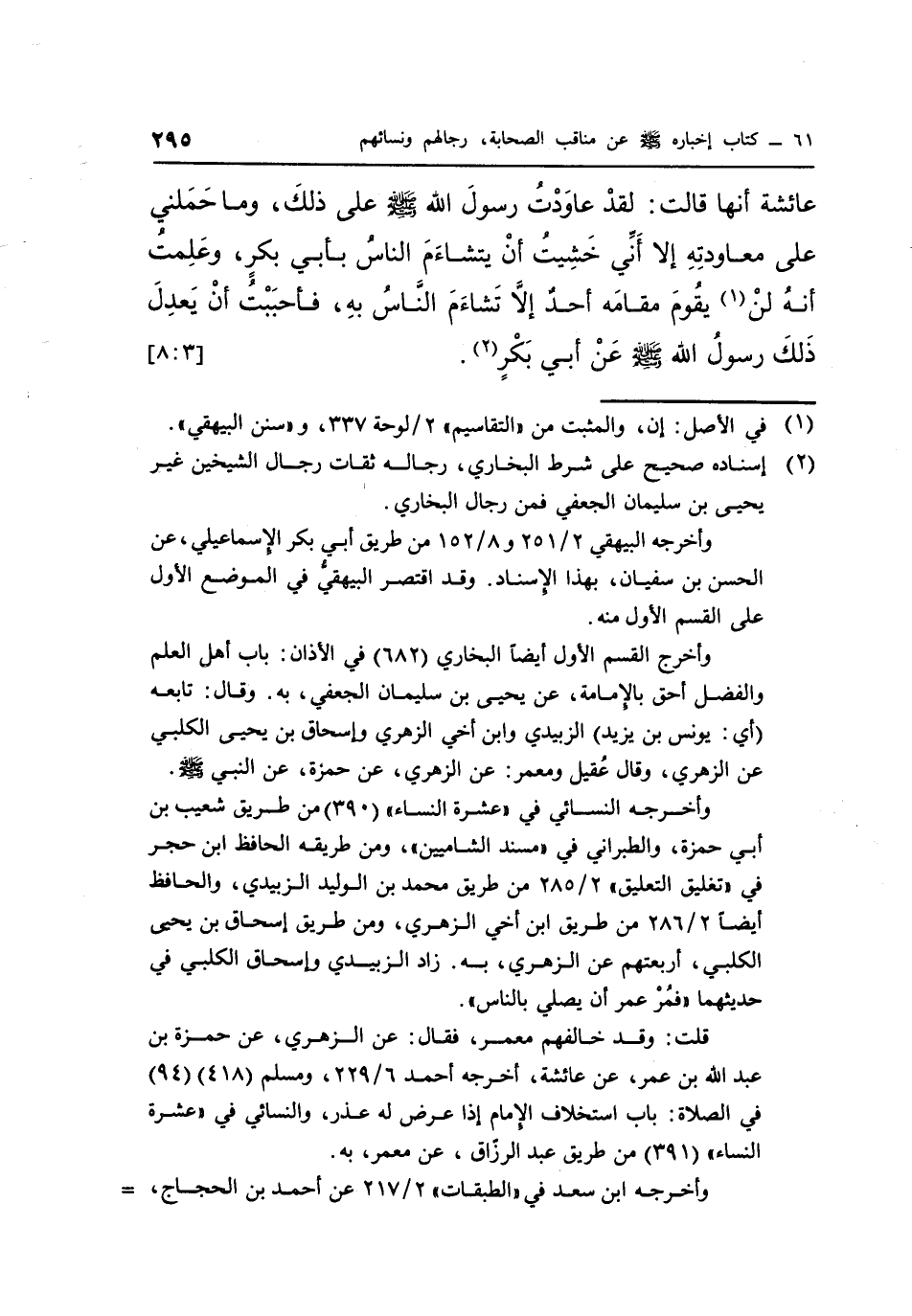 عَائِشَةَ أَنَّهَا قَالَتْ: لَقَدْ عَاوَدْتُ رَسُولُ اللَّهِ صَلَّى اللَّهُ عَلَيْهِ وَسَلَّمَ عَلَى ذلك، وحملني عَلَى مُعَاوَدَتِهِ إِلَّا أَنِّي خَشِيتُ أَنْ يَتَشَاءَمَ النَّاسُ بِأَبِي بَكْرٍ، وَعَلِمْتُ أَنَّهُ لَنْ"1" يَقُومَ مَقَامَهُ أَحَدٌ إِلَّا تَشَاءَمَ النَّاسُ بِهِ، فَأَحْبَبْتُ أَنْ يَعْدِلَ ذَلِكَ رَسُولَ اللَّهِ صَلَّى اللَّهُ عَلَيْهِ وَسَلَّمَ عن أبي بكر"2". [3: 8]