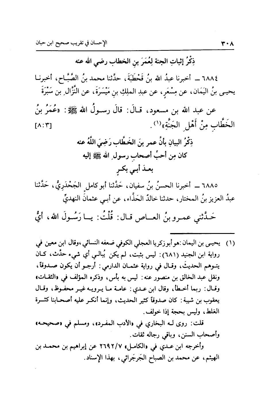 6884 - أَخْبَرَنَا عَبْدُ اللَّهِ بْنُ قَحْطَبَةَ، حَدَّثَنَا مُحَمَّدُ بْنُ الصَّبَّاحِ، أَخْبَرَنَا يَحْيَى بْنُ الْيَمَانِ، عَنْ مِسْعَرٍ، عَنْ عَبْدِ الْمَلِكِ بْنِ مَيْسَرَةَ، عَنِ النَّزَّالِ بْنِ سَبْرَةَ، عَنْ عَبْدِ اللَّهِ بْنِ مَسْعُودٍ، قَالَ: قَالَ رَسُولُ اللَّهِ صَلَّى اللَّهُ عَلَيْهِ وَسَلَّمَ: "عُمَرَ بْنُ الْخَطَّابِ من أهل الجنة" "1".. [3: 8]