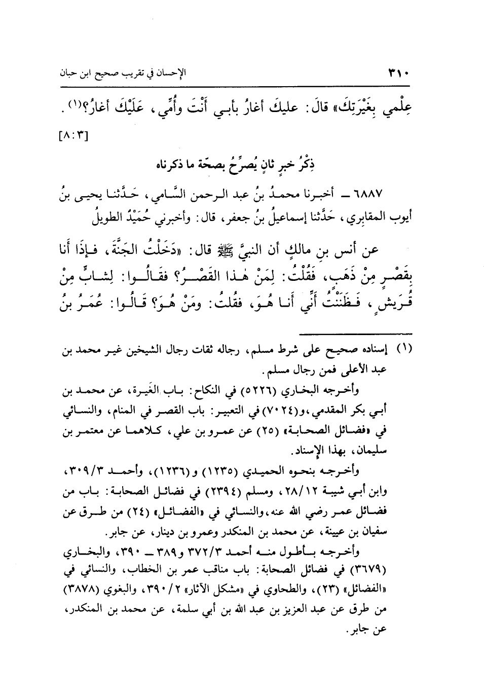 عَنْ أَنَسِ بْنِ مَالِكٍ أَنَّ النَّبِيَّ صَلَّى اللَّهُ عَلَيْهِ وَسَلَّمَ قَالَ: "دَخَلْتُ الْجَنَّةَ، فَإِذَا أَنَا بِقَصْرٍ مِنْ ذَهَبٍ، فَقُلْتُ: لِمَنْ هَذَا الْقَصْرُ، فَقَالُوا: لِشَابٍّ مِنْ قُرَيْشٍ، فَظَنَنْتُ أَنِّي أَنَا هُوَ، فَقُلْتُ: وَمَنْ هُوَ؟ قَالُوا: عُمَرُ بْنُ الْخَطَّابِ"1" [3: 8]