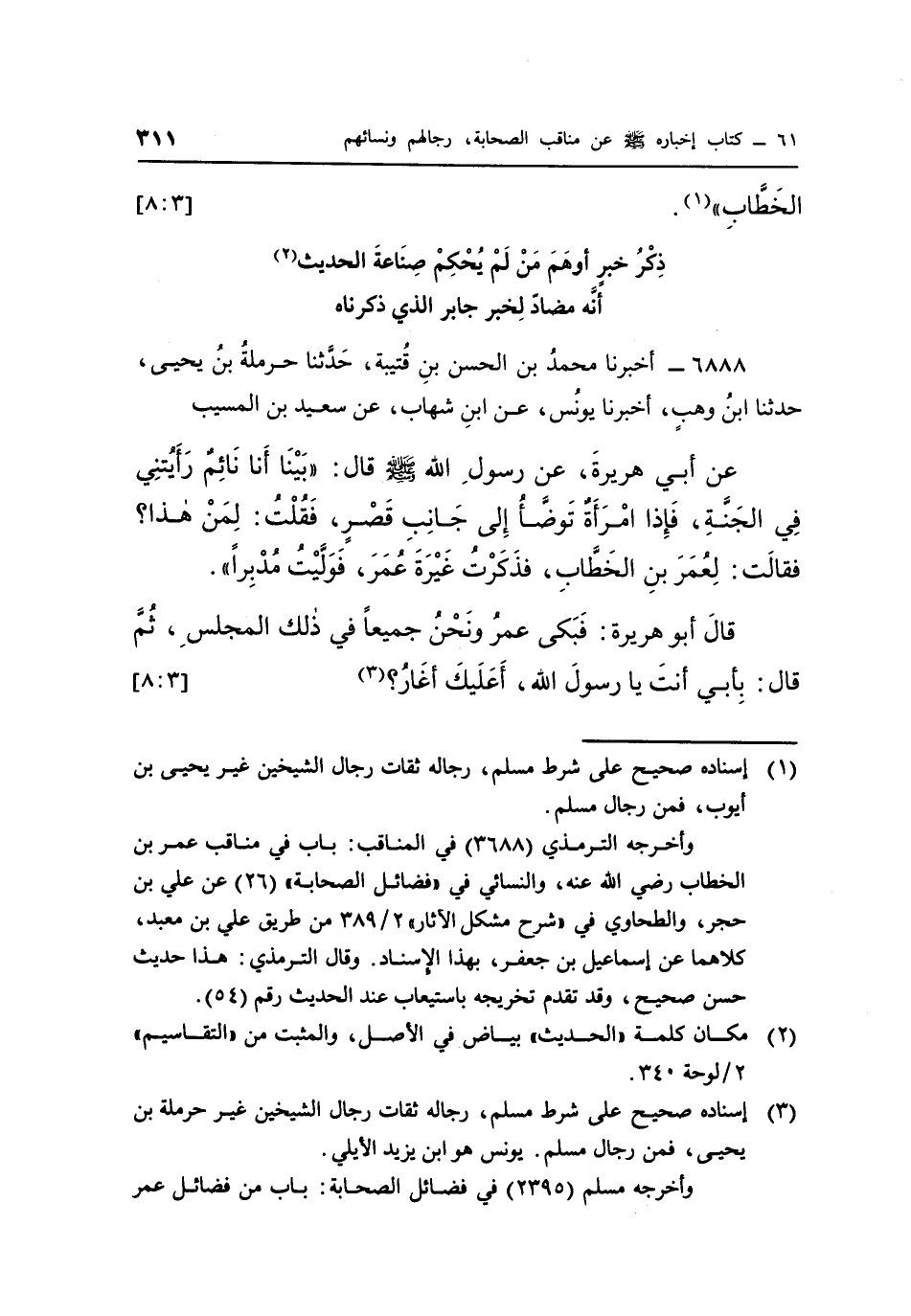 قَالَ أَبُو هُرَيْرَةَ: فَبَكَى عُمَرُ وَنَحْنُ جَمِيعًا فِي ذَلِكَ الْمَجْلِسِ، ثُمَّ قَالَ: بِأَبِي أَنْتَ يَا رَسُولَ اللَّهِ، أَعَلَيْكَ أغار؟ "3".. [3: 8]