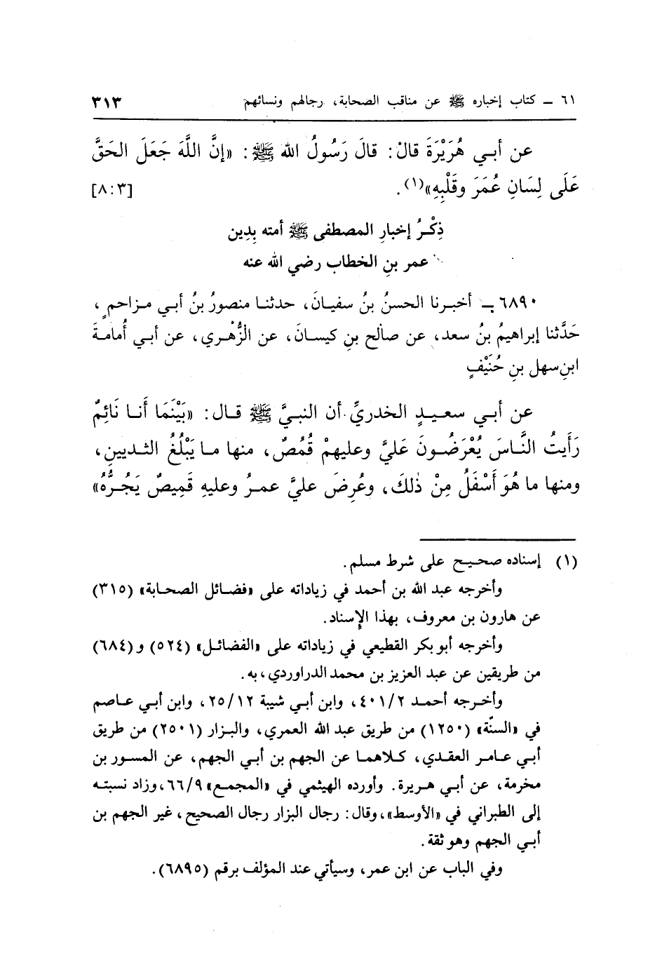 عَنْ أَبِي سَعِيدٍ الْخُدْرِيِّ أَنَّ النَّبِيَّ صَلَّى اللَّهُ عَلَيْهِ وَسَلَّمَ قَالَ: "بَيْنَمَا أَنَا نَائِمٌ رَأَيْتُ النَّاسَ يُعْرَضُونَ عَلَيَّ وَعَلَيْهِمْ قُمُصٌ، مِنْهَا مَا يَبْلُغُ الثَّدْيَيْنِ، وَمِنْهَا مَا هُوَ أَسْفَلُ مِنْ ذَلِكَ، وَعُرِضَ عَلَيَّ عُمَرُ وَعَلَيْهِ قَمِيصٌ يَجُرُّهُ"ذِكْرُ إِخْبَارِ الْمُصْطَفَى صَلَّى اللَّهُ عَلَيْهِ وَسَلَّمَ أُمَّتَهُ بِدِينِ عُمَرَ بْنِ الْخَطَّابِ رَضِيَ اللَّهُ عَنْهُ