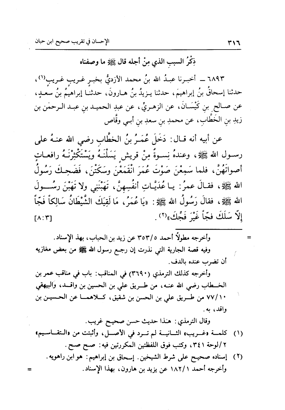 عَنْ أَبِيهِ أَنَّهُ قَالَ: "دَخَلَ عُمَرُ بْنُ الْخَطَّابِ رَضِيَ اللَّهُ عَنْهُ عَلَى رَسُولِ اللَّهِ صَلَّى اللَّهُ عَلَيْهِ وَسَلَّمَ، وَعِنْدَهُ نِسْوَةٌ مِنْ قُرَيْشٍ يَسَلْنَهُ وَيَسْتَكْثِرْنَهُ رَافِعَاتٍ أَصْوَاتَهُنَّ، فَلَمَّا سَمِعْنَ صَوْتَ عُمَرَ انْقَمَعْنَ وَسَكَتْنَ، فَضَحِكَ رَسُولُ اللَّهِ صَلَّى اللَّهُ عَلَيْهِ وَسَلَّمَ، فَقَالَ عُمَرُ: يَا عُدَيَّاتِ أَنْفُسِهِنَّ، تَهَبْنَنِي وَلَا تَهَبْنَ رَسُولَ اللَّهِ صَلَّى اللَّهُ عَلَيْهِ وَسَلَّمَ، فَقَالَ رَسُولُ اللَّهِ صَلَّى اللَّهُ عَلَيْهِ وَسَلَّمَ: "يَا عُمَرُ، مَا لَقِيَكَ الشَّيْطَانُ سَالِكًا فَجًّا إِلَّا سَلَكَ فَجًّا غير فجك" "2". [3: 8]