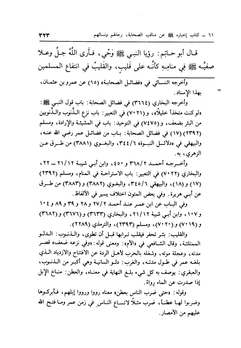 قَالَ أَبُو حَاتِمٍ: رُؤْيَا النَّبِيِّ صَلَّى اللَّهُ عَلَيْهِ وَسَلَّمَ وَحْيٌ، فَأَرَى اللَّهِ جَلَّ وَعَلَا صَفِيَّهِ صَلَّى اللَّهُ عَلَيْهِ وَسَلَّمَ فِي مَنَامِهِ كَأَنَّهُ عَلَى قَلِيبٍ، وَالْقَلِيبُ فِي انْتِفَاعِ الْمُسْلِمِينَ