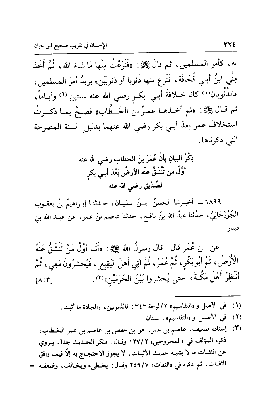 "3" إسناده ضعيف، عاصم بن عمر: هو ابن حَفْصِ بْنِ عَاصِمِ بْنِ عُمَرَ بْنِ الْخَطَّابِ، ذكره المؤلف "المجروحين" 2/127 وقال: منكر الحديث جدا، يروي عن الثقات ما لا يشبه حديث الأثبات، لا يجوز الاحتجاج به إلا فيما وافق الثقات، ثم ذكره في "الثقات" 7/259 وقال: يخطئ ويخالف، وضعفه =