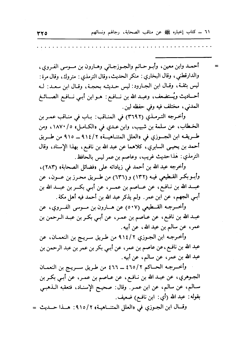 = أحمد وابن معين، وأبو حاتم والجوزجاني وهارون بن موسى الفروي، والدارقطني، وقال البخاري: منكر الحديث، وقال الترمذي: متروك، وقال مرة: ليس بثقة، وقال ابن الجارود: ليس حديثه بحجة، وقال ابن سعد: له أحاديث ويستضعف، وعبد الله بن نافع: هو ابن أبي نافع الصائغ المدني، مختلف فيه وفي حفظه لين.