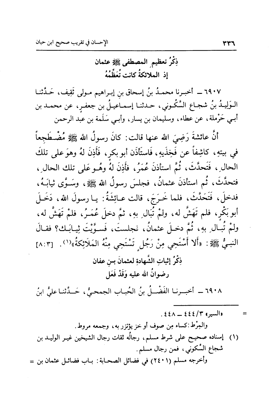 أَنَّ عَائِشَةَ رَضِيَ اللَّهُ عَنْهَا قَالَتْ: "كَانَ رَسُولُ اللَّهِ صَلَّى اللَّهُ عَلَيْهِ وَسَلَّمَ مُضْطَجِعًا فِي بَيْتِهِ، كَاشِفًا عَنْ فَخِذَيْهِ، فَاسْتَأْذَنَ أَبُو بَكْرٍ فَأَذِنَ لَهُ وَهُوَ عَلَى تِلْكَ الْحَالِ، فَتَحَدَّثَ، ثُمَّ اسْتَأْذَنَ عُمَرُ، فَأَذِنَ لَهُ وَهُوَ عَلَى تِلْكَ الْحَالِ، فَتَحَدَّثَ، ثُمَّ اسْتَأْذَنَ عُثْمَانُ، فَجَلَسَ رَسُولُ اللَّهِ صَلَّى اللَّهُ عَلَيْهِ وَسَلَّمَ، وَسَوَّى ثِيَابَهُ، فَدَخَلَ فَتَحَدَّثَ، فَلَمَّا خَرَجَ، قَالَتْ عَائِشَةُ: يَا رَسُولَ اللَّهِ، دَخَلَ أَبُو بَكْرٍ، فَلَمْ تَهَشَّ لَهُ، وَلَمْ تُبَالِ بِهِ، ثُمَّ دَخَلَ عُمَرُ، فَلَمْ تَهَشَّ لَهُ، وَلَمْ تُبَالِ بِهِ، ثُمَّ دَخَلَ عُثْمَانُ، فَجَلَسْتَ، فَسَوَّيْتَ ثِيَابَكَ؟ فَقَالَ النَّبِيُّ صَلَّى اللَّهُ عَلَيْهِ وَسَلَّمَ: "أَلَا أستحي من رجل تستحي منه الملائكة" "1". [3: 8]