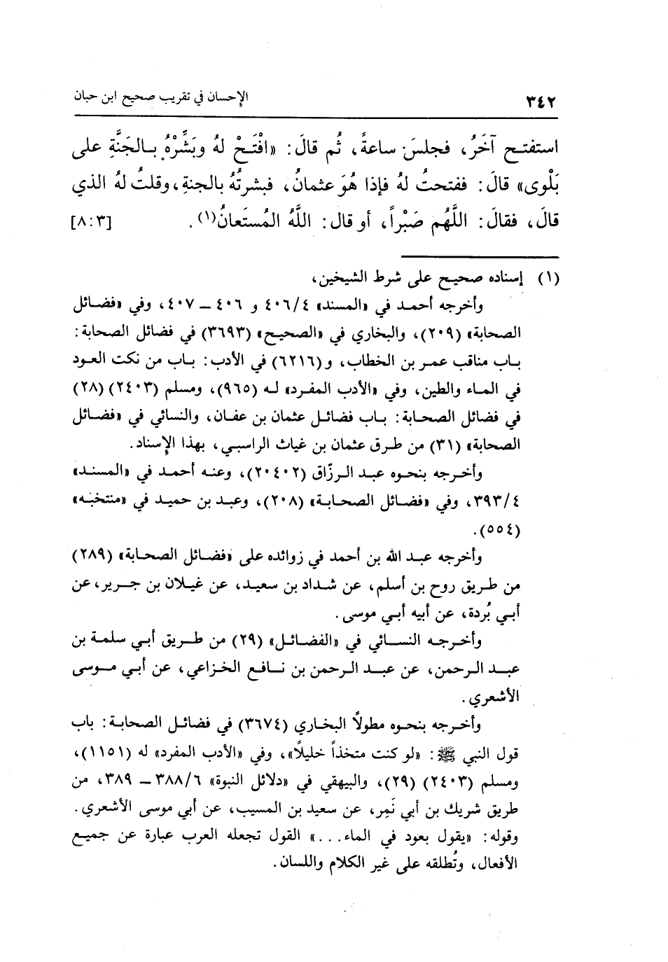 اسْتَفْتَحَ آخَرُ، فَجَلَسَ سَاعَةً، ثُمَّ قَالَ: "افْتَحْ لَهُ وَبَشِّرْهُ بِالْجَنَّةِ عَلَى بَلْوًى" قَالَ: فَفَتَحْتُ لَهُ فَإِذَا هُوَ عُثْمَانُ، فَبَشَّرْتُهُ بِالْجَنَّةِ، وَقُلْتُ لَهُ الَّذِي قَالَ، فَقَالَ: اللَّهُمَّ صَبْرًا، أَوْ قال: الله المستعان"1". [3: 8]