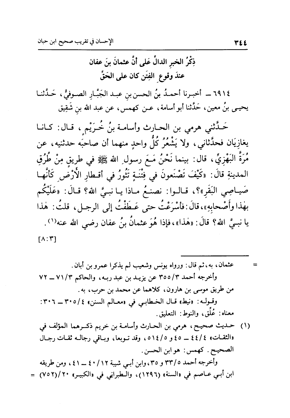 حَدَّثَنِي هَرَمِيُّ بْنُ الْحَارِثِ وَأُسَامَةُ بْنُ خُرَيْمٍ، قَالَ: كَانَا يُغَازِيَانِ فَحَدَّثَانِي، وَلَا يَشْعُرُ كُلُّ وَاحِدٍ مِنْهُمَا أَنَّ صَاحِبَهُ حَدَّثَنِيهِ، عَنْ مُرَّةَ الْبَهْزِيِّ، قَالَ: بَيْنَمَا نَحْنُ مَعَ رَسُولِ اللَّهِ صَلَّى اللَّهُ عَلَيْهِ وَسَلَّمَ فِي طَرِيقٍ مِنْ طُرُقِ الْمَدِينَةِ قَالَ: "كَيْفَ تَصْنَعُونَ فِي فِتْنَةٍ تَثُورُ فِي أَقْطَارِ الْأَرْضِ كَأَنَّهَا صَيَاصِي الْبَقَرِ"؟، قَالُوا: نَصْنَعُ مَاذَا يَا نَبِيَّ اللَّهِ؟ قَالَ: " عَلَيْكُمْ بِهَذَا وَأَصْحَابِهِ"، قَالَ: فَأَسْرَعْتُ حَتَّى عَطَفْتُ إِلَى الرَّجُلِ، قُلْتُ: هَذَا يَا نَبِيَّ اللَّهِ؟ قَالَ: "هَذَا"، فَإِذَا هُوَ عُثْمَانُ بْنُ عفان رضي الله عنه "1". [3: 8]