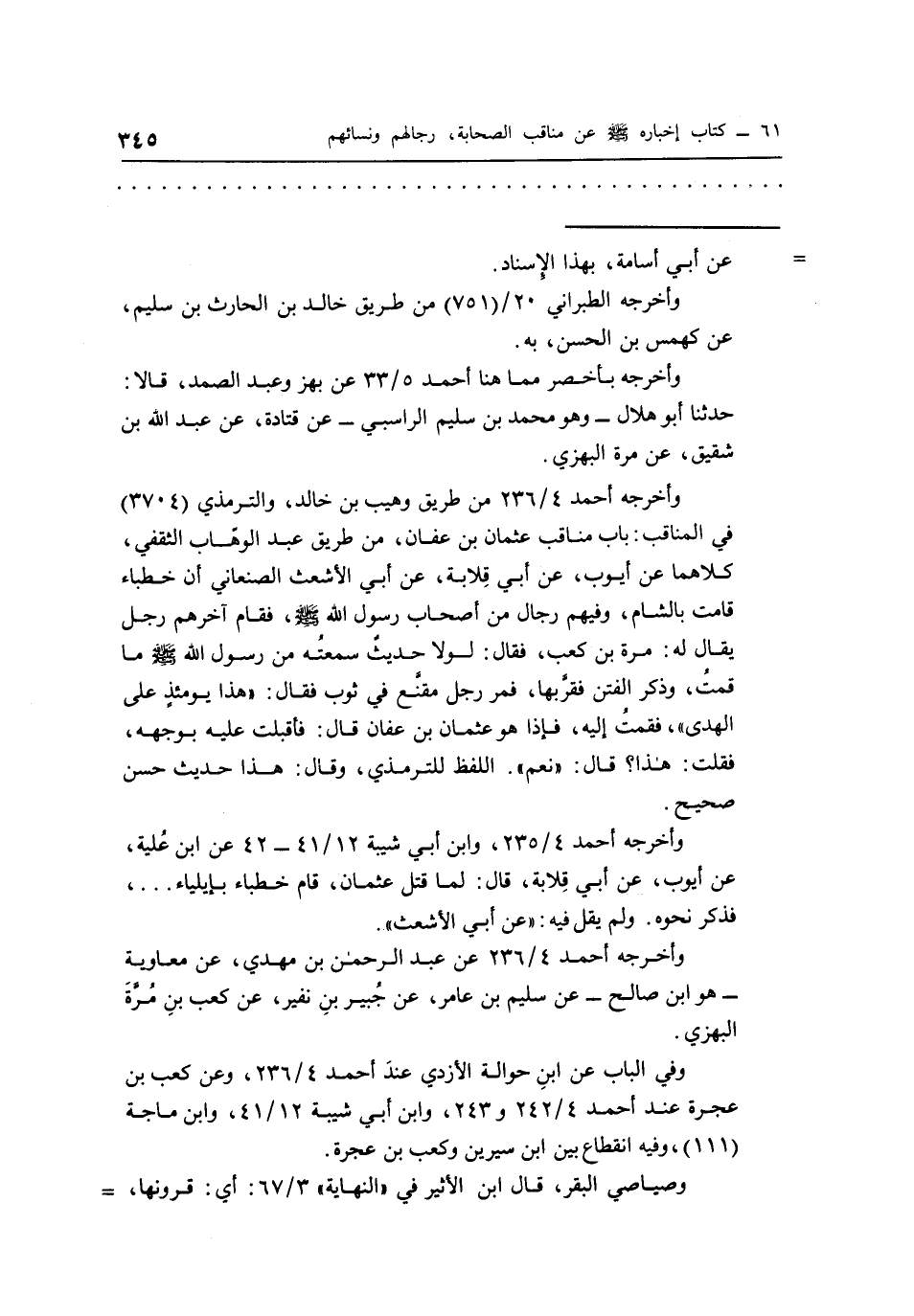 وأخرجه أحمد 4/236 من طريق وهيببن خالد، والترمذي "3704" في المناقب: با مناقب عثمان بن عفان، من طريق عبد الوهاب الثقفي، كلاهما عن أيوب، عن أبي قلابة، عن أبي الأشعث الصنعاني أن خطباء قامت بالشام، وفيهم رجال من أصحاب رسول الله صلى الله عليه وسلم، فقام آخرهم رجل يقال له: مرة بن كعب، فقال: لولا حديث سمعته من رسول الله صلى الله عليه وسلم ما قمت، وذكر الفتن فقربها، فمر رجل مقنع في ثوب فقال: "هذا يومئذ على الهدي"، فقمت إليه، فإذا هو عثمان بن عفان قال: فأقبلت عليه بوجهه، فقلت: هذا؟ قال: "نعم". اللفظ للترمذي، وقال هذا حديث حسن صحيح.