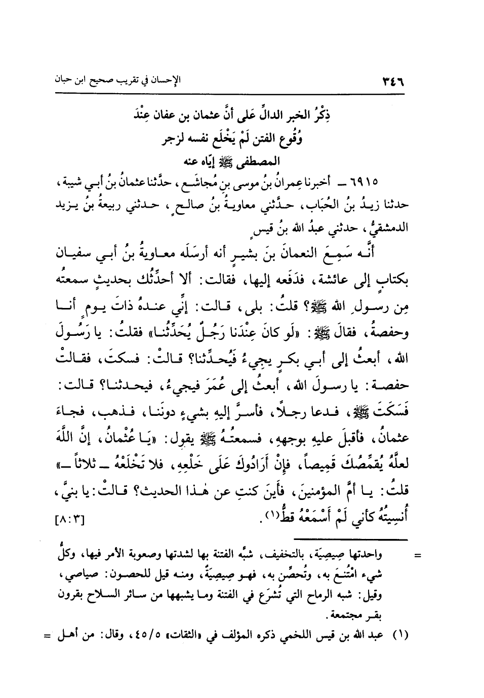 أَنَّهُ سَمِعَ النُّعْمَانَ بْنَ بَشِيرٍ أَنَّهُ أَرْسَلَهُ مُعَاوِيَةُ بْنُ أَبِي سُفْيَانَ بِكِتَابٍ إِلَى عَائِشَةَ، فَدَفَعَهُ إِلَيْهَا، فَقَالَتْ: أَلَا أُحَدِّثُكَ بِحَدِيثٍ سَمِعْتُهُ مِنْ رَسُولِ اللَّهِ صَلَّى اللَّهُ عَلَيْهِ وَسَلَّمَ: قُلْتُ: بَلَى، قَالَتْ: إِنِّي عِنْدَهُ ذات يوم أنا وحفصة، فقال صَلَّى اللَّهُ عَلَيْهِ وَسَلَّمَ: "لَوْ كَانَ عِنْدَنَا رَجُلٌ يُحَدِّثُنَا" فَقُلْتُ: يَا رَسُولَ اللَّهِ، أَبْعَثُ إِلَى أَبِي بَكْرٍ يَجِيءُ فَيُحَدِّثُنَا؟ قَالَتْ: فَسَكَتَ، فَقَالَتْ حَفْصَةُ: يَا رَسُولَ اللَّهِ، أَبْعَثُ إِلَى عُمَرَ فَيَجِيءُ فَيُحَدِّثُنَا، قَالَتْ: فَسَكَتَ صَلَّى اللَّهُ عَلَيْهِ وَسَلَّمَ، فَدَعَا رَجُلًا، فَأَسَرَّ إِلَيْهِ بِشَيْءٍ دُونَنَا، فَذَهَبَ، فَجَاءَ عُثْمَانُ، فَأَقْبَلَ عَلَيْهِ بِوَجْهِهِ، فَسَمِعْتُهُ صَلَّى اللَّهُ عَلَيْهِ وَسَلَّمَ يَقُولُ: "يَا عُثْمَانُ، إِنَّ اللَّهَ لَعَلَّهُ يُقَمِّصُكَ قَمِيصًا، فَإِنْ أَرَادُوكَ عَلَى خَلْعِهِ، فَلَا تَخْلَعْهُ – ثَلَاثًا -" قُلْتُ: يَا أُمَّ الْمُؤْمِنِينَ، فَأَيْنَ كُنْتِ عَنْ هَذَا الْحَدِيثِ، قَالَتْ: يَا بُنَيَّ، أُنْسِيتُهُ كَأَنِّي لَمْ أسمعه قط "1". [3: 8]