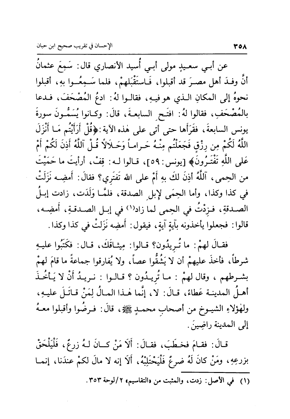 عَنْ أَبِي سَعِيدٍ مَوْلَى أَبِي أُسَيْدٍ الْأَنْصَارِيِّ قَالَ: سَمِعَ عُثْمَانُ أَنَّ وَفْدَ أَهْلَ مِصْرَ قَدْ أَقْبَلُوا، فَاسْتَقْبَلَهُمْ، فَلَمَّا سَمِعُوا بِهِ، أَقْبَلُوا نَحْوَهُ إِلَى الْمَكَانِ الَّذِي هُوَ فِيهِ، فَقَالُوا: له ادع المصحف، فدعا بالمصحف، فقالوا لَهُ: افْتَحِ السَّابِعَةَ، قَالَ: وَكَانُوا يُسَمُّونَ سُورَةَ يُونُسَ السَّابِعَةَ، فَقَرَأَهَا حَتَّى أَتَى عَلَى هَذِهِ الْآيَةِ: {قُلْ أَرَأَيْتُمْ مَا أَنْزَلَ اللَّهُ لَكُمْ مِنْ رِزْقٍ فَجَعَلْتُمْ مِنْهُ حَرَاماً وَحَلالاً قُلْ آللَّهُ أَذِنَ لَكُمْ أَمْ عَلَى اللَّهِ تَفْتَرُونَ} [يونس:59] قَالُوا لَهُ: قِفْ، أَرَأَيْتَ مَا حَمَيْتَ مِنَ الْحِمَى، آللَّهُ أَذِنَ لَكَ بِهِ أَمْ عَلَى اللَّهِ تَفْتَرِي؟ فَقَالَ: أَمْضِهِ نَزَلَتْ فِي كَذَا وَكَذَا، وَأَمَّا الْحِمَى لِإِبِلِ الصَّدَقَةِ، فَلَمَّا وَلَدَتْ، زَادَتْ إِبِلُ الصَّدَقَةِ، فَزِدْتُ فِي الْحِمَى لَمَّا زَادَ "1" فِي إِبِلِ الصَّدَقَةِ، أَمْضِهِ، قَالُوا: فَجَعَلُوا يَأْخُذُونَهُ بِآيَةٍ آيَةٍ، فَيَقُولُ: أَمْضِهِ نَزَلَتْ فِي كَذَا وَكَذَا.