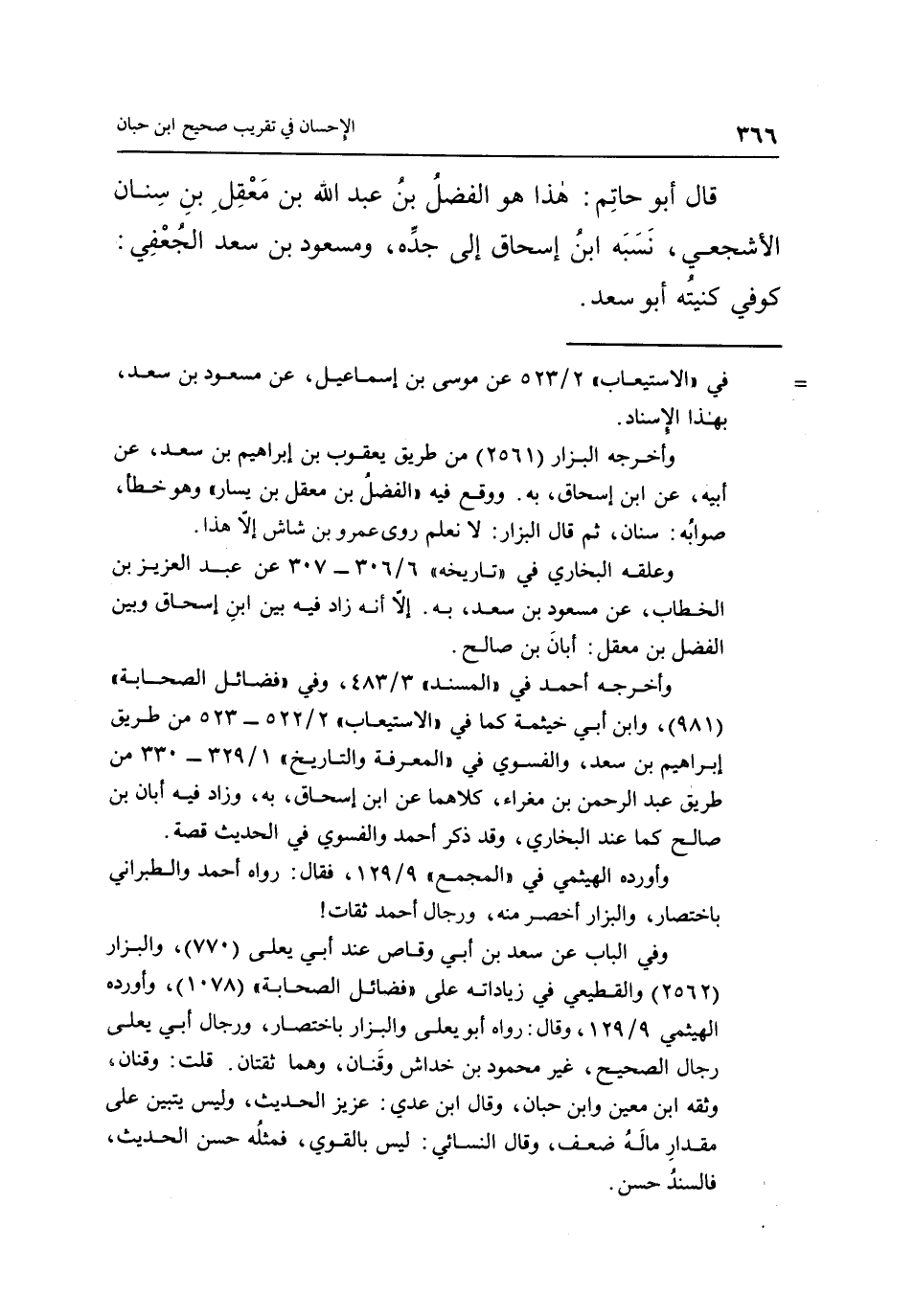 قَالَ أَبُو حَاتِمٍ: هَذَا هُوَ الْفَضْلُ بْنُ عَبْدِ اللَّهِ بْنِ مَعْقِلِ بْنِ سِنَانٍ الْأَشْجَعِيُّ، نَسَبَهُ ابْنُ إِسْحَاقَ إِلَى جَدِّهِ، وَمَسْعُودُ بْنُ سعد الجعفي: كوفي كنيته أبو سعد.