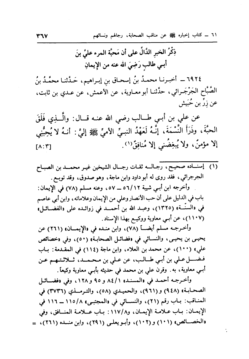 ذِكْرُ الْخَبَرِ الدَّالِّ عَلَى أَنَّ مَحَبَّةَ الْمَرْءِ عَلِيُّ بْنُ أَبِي طَالِبٍ رَضِيَ اللَّهُ عَنْهُ مِنَ الْإِيمَانِ