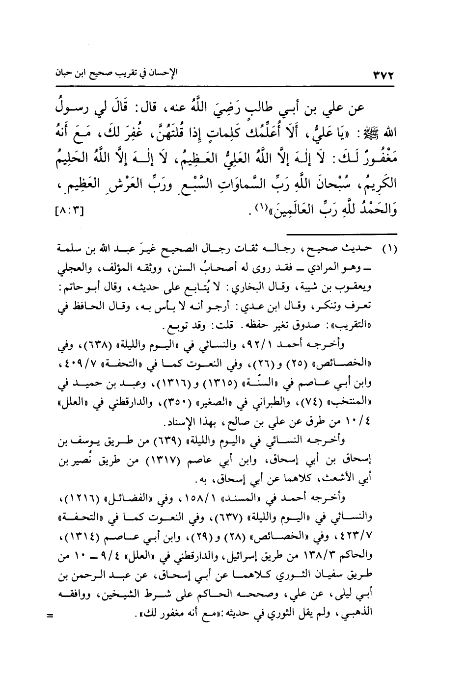 عَنْ عَلِيُّ بْنُ أَبِي طَالِبٍ رَضِيَ اللَّهُ عَنْهُ، قَالَ: قَالَ لِي رَسُولُ اللَّهِ صَلَّى اللَّهُ عَلَيْهِ وَسَلَّمَ: "يَا عَلِيُّ، أَلَا أُعَلِّمُكَ كَلِمَاتٍ إِذَا قُلْتَهُنَّ، غُفِرَ لَكَ، مَعَ أَنَّهُ مَغْفُورٌ لَكَ: لَا إِلَهَ إِلَّا اللَّهُ الْعَلِيُّ الْعَظِيمُ، لَا إِلَهَ إِلَّا اللَّهُ الْحَلِيمُ الْكَرِيمُ، سُبْحَانَ اللَّهِ رَبِّ السَّمَاوَاتِ السَّبْعِ وَرَبِّ الْعَرْشِ العظيم، والحمد لله رب العالمين" "1". [3: 8]