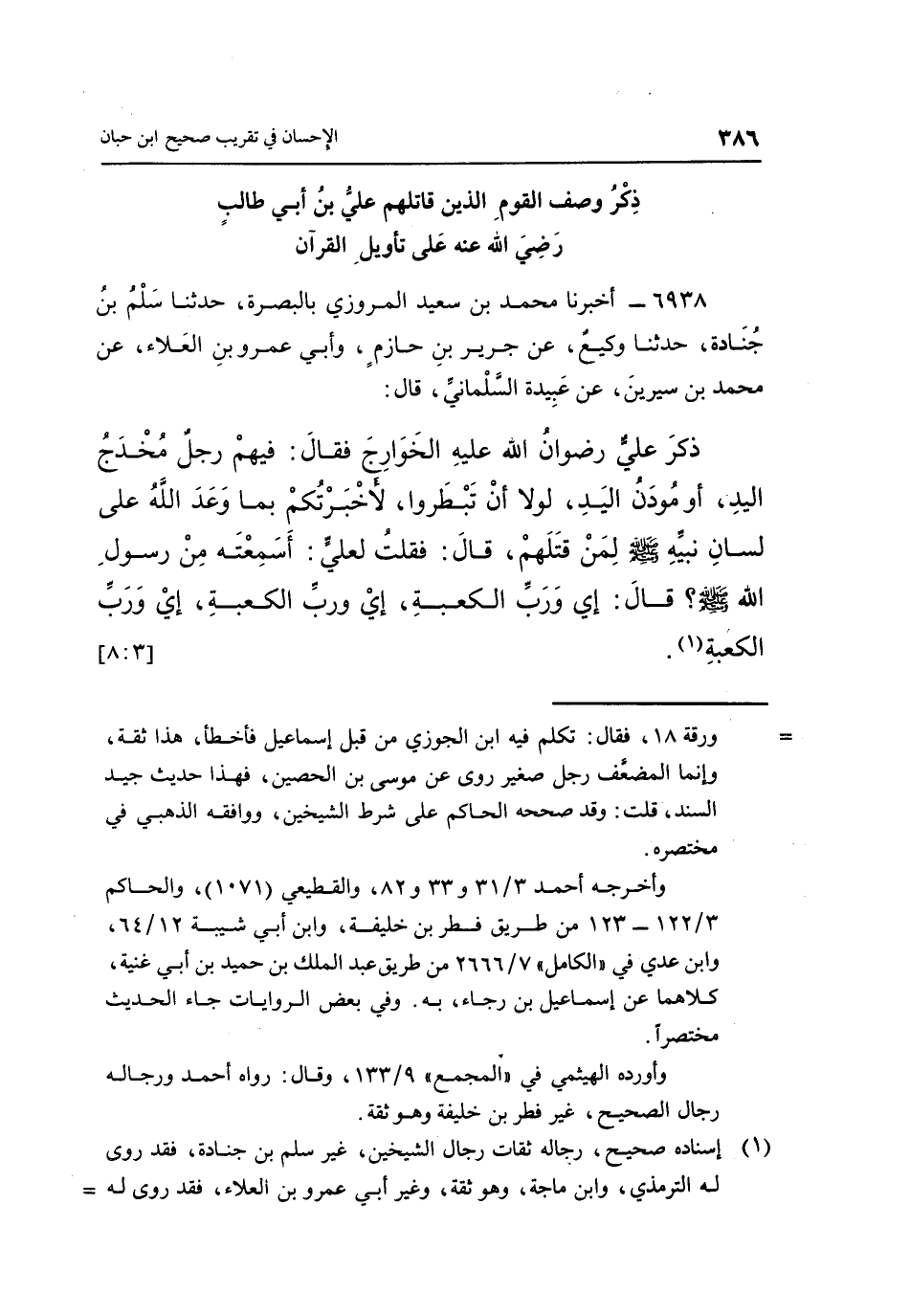 عَنْ مُحَمَّدِ بْنِ سِيرِينَ، عَنْ عَبِيدَةَ السَّلْمَانِيِّ، قَالَ: "ذَكَرَ عَلِيٌّ رِضْوَانُ اللَّهِ عَلَيْهِ الْخَوَارِجَ فَقَالَ: فِيهِمْ رَجُلٌ مُخْدَجُ الْيَدِ، أَوْ مُودَنُ الْيَدِ، لَوْلَا أَنْ تَبْطَرُوا، لَأَخْبَرْتُكُمْ بِمَا وَعَدَ اللَّهُ عَلَى لِسَانِ نَبِيِّهِ صَلَّى اللَّهُ عَلَيْهِ وَسَلَّمَ لِمَنْ قَتَلَهُمْ، قَالَ: فَقُلْتُ لِعَلِيٍّ: أَسَمِعْتَهُ مِنْ رَسُولِ اللَّهِ صَلَّى اللَّهُ عَلَيْهِ وَسَلَّمَ؟ قَالَ: "إِي وَرَبِّ الْكَعْبَةِ، إِي وَرَبِّ الْكَعْبَةِ، إِي وَرَبِّ الكعبة" "1". [3: 8]