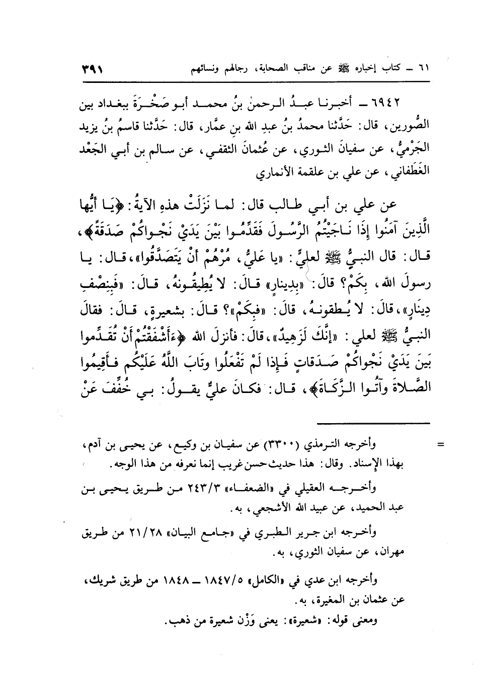 وأخرجه الحاكم 2/481 - 482 من طريق يحيى بن المغيرة السعدي، عن جرير، عن منصور، عَنْ مُجَاهِدٍ، عَنْ عَبْدِ الرَّحْمَنِ بْنِ أَبِي ليلى قال: قال عَلِيُّ بْنُ أَبِي طَالِبٍ رَضِيَ اللَّهُ عَنْهُ: عن في كتاب الله لآية ما عمل بها أحد ولا يعمل بها أحد بعدي: آية النجوى: {يَا أَيُّهَا الَّذِينَ آمَنُوا إِذَا نَاجَيْتُمُ الرَّسُولَ فَقَدِّمُوا بَيْنَ يَدَيْ نَجْوَاكُمْ صَدَقَةً} الآية، قال: كان عندي دينار، فبعته بعشرة دراهم، فناجيت النبي صلى الله عليه وسلم، فكنت كلما ناجيت النبي صلى الله عليه وسلم قدمت بين يدي نجواي درهما، ثم نسخت، فلم يعمل بها أحد، فنزلت: {أَأَشْفَقْتُمْ أَنْ تُقَدِّمُوا بَيْنَ يَدَيْ نَجْوَاكُمْ صَدَقَاتٍ} الآية. وصححه الحاكم على شرط الشيخين، ووافقه الذهبي.