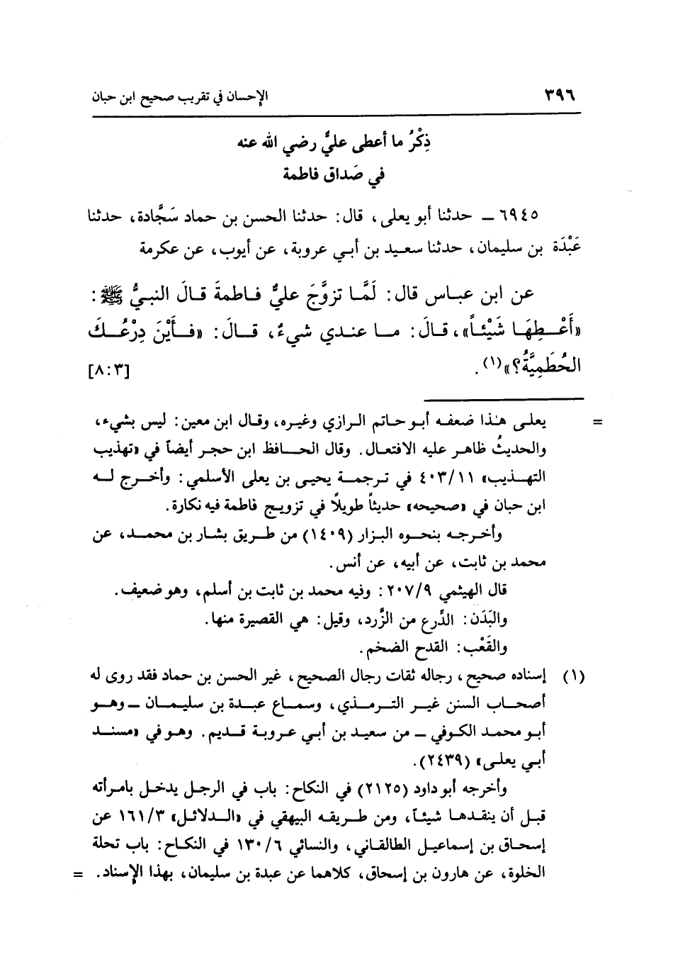 عَنِ ابْنِ عَبَّاسٍ قَالَ: لَمَّا تَزَوَّجَ عَلِيٌّ فَاطِمَةَ، قَالَ النَّبِيُّ صَلَّى اللَّهُ عَلَيْهِ وَسَلَّمَ: "أَعْطِهَا شَيْئًا " قَالَ: مَا عِنْدِي شَيْءٌ، قَالَ: "فَأَيْنَ دِرْعُكَ الْحُطَمِيَّةُ؟ " "1". [3: 8]