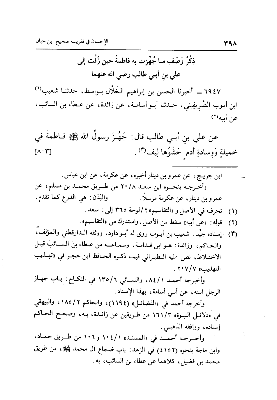 عَنْ عَلِيِّ بْنِ أَبِي طَالِبٍ قَالَ: جَهَّزَ رَسُولُ اللَّهِ صَلَّى اللَّهُ عَلَيْهِ وَسَلَّمَ فَاطِمَةَ فِي خَمِيلَةٍ وَوِسَادَةِ أَدَمٍ حَشْوُهَا لِيفٌ "3". [3: 8]