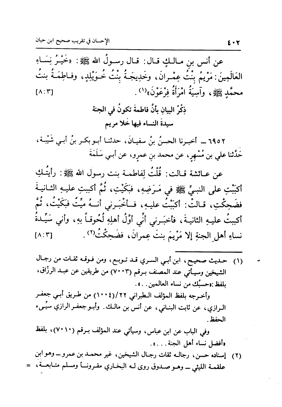 عَنْ عَائِشَةَ قَالَتْ: قُلْتُ لِفَاطِمَةَ بِنْتُ رَسُولِ اللَّهِ صَلَّى اللَّهُ عَلَيْهِ وَسَلَّمَ: رَأَيْتُكِ أَكْبَبْتِ عَلَى النَّبِيِّ صَلَّى اللَّهُ عَلَيْهِ وَسَلَّمَ فِي مَرَضِهِ، فَبَكَيْتِ، ثُمَّ أَكْبَبْتِ عَلَيْهِ الثَّانِيَةَ فَضَحِكْتِ، قَالَتْ: أَكْبَبْتُ عَلَيْهِ، فَأَخْبَرَنِي أَنَّهُ مَيِّتٌ فَبَكَيْتُ، ثُمَّ أَكْبَبْتُ عَلَيْهِ الثَّانِيَةَ، فَأَخْبَرَنِي أَنِّي أَوَّلُ أَهْلِهِ لُحُوقًا بِهِ، وَأَنِّي سَيِّدَةُ نِسَاءِ أَهْلِ الْجَنَّةِ إِلَّا مريم بنت عمران، فضحكت"2". [3: 8]