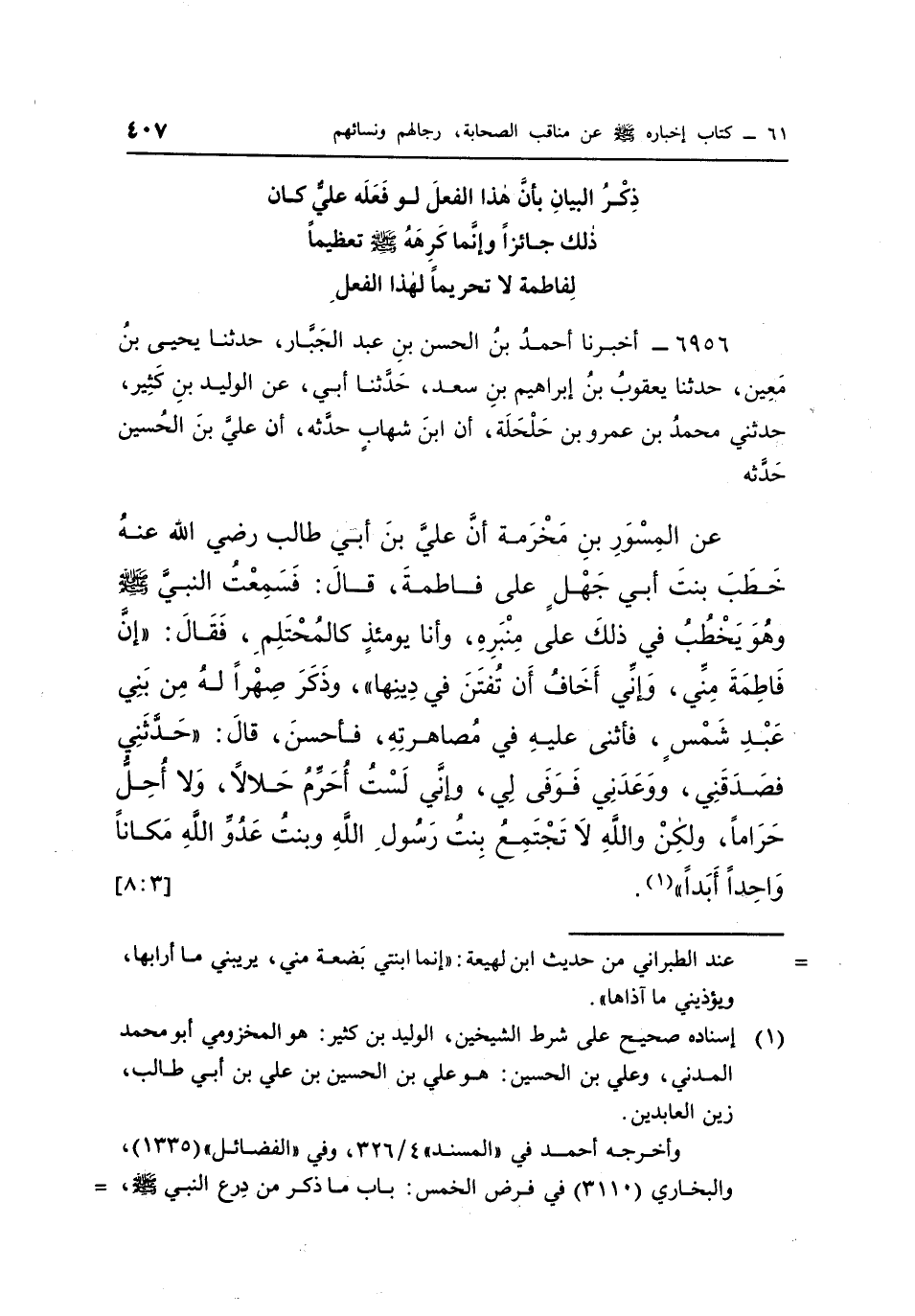 عَنِ الْمِسْوَرِ بْنِ مَخْرَمَةَ أَنَّ عَلِيُّ بْنُ أَبِي طَالِبٍ رَضِيَ اللَّهُ عَنْهُ خَطَبَ بِنْتَ أَبِي جَهْلٍ عَلَى فَاطِمَةَ، قَالَ: فَسَمِعْتُ النَّبِيَّ صَلَّى اللَّهُ عَلَيْهِ وَسَلَّمَ وَهُوَ يَخْطُبُ فِي ذَلِكَ عَلَى مِنْبَرِهِ، وَأَنَا يَوْمَئِذٍ كالْمُحْتَلِمِ، فَقَالَ: "إِنَّ فَاطِمَةَ مِنِّي، وَإِنِّي أَخَافُ أَنْ تُفْتَنَ فِي دِينِهَا" وَذَكَرَ صِهْرًا لَهُ مِنْ بَنِي عَبْدِ شَمْسٍ، فَأَثْنَى عَلَيْهِ فِي مُصَاهَرَتِهِ، فَأَحْسَنَ، قَالَ: "حَدَّثَنِي فَصَدَقَنِي، وَوَعَدَنِي فَوَفَى لِي، وَإِنِّي لَسْتُ أُحَرِّمُ حَلَالًا، وَلَا أُحِلُّ حَرَامًا، وَلَكِنْ وَاللَّهِ لَا تَجْتَمِعُ بِنْتُ رَسُولِ اللَّهِ وَبِنْتُ عَدُوِّ اللَّهِ مكانا واحدا أبدا" "1". [3: 8]