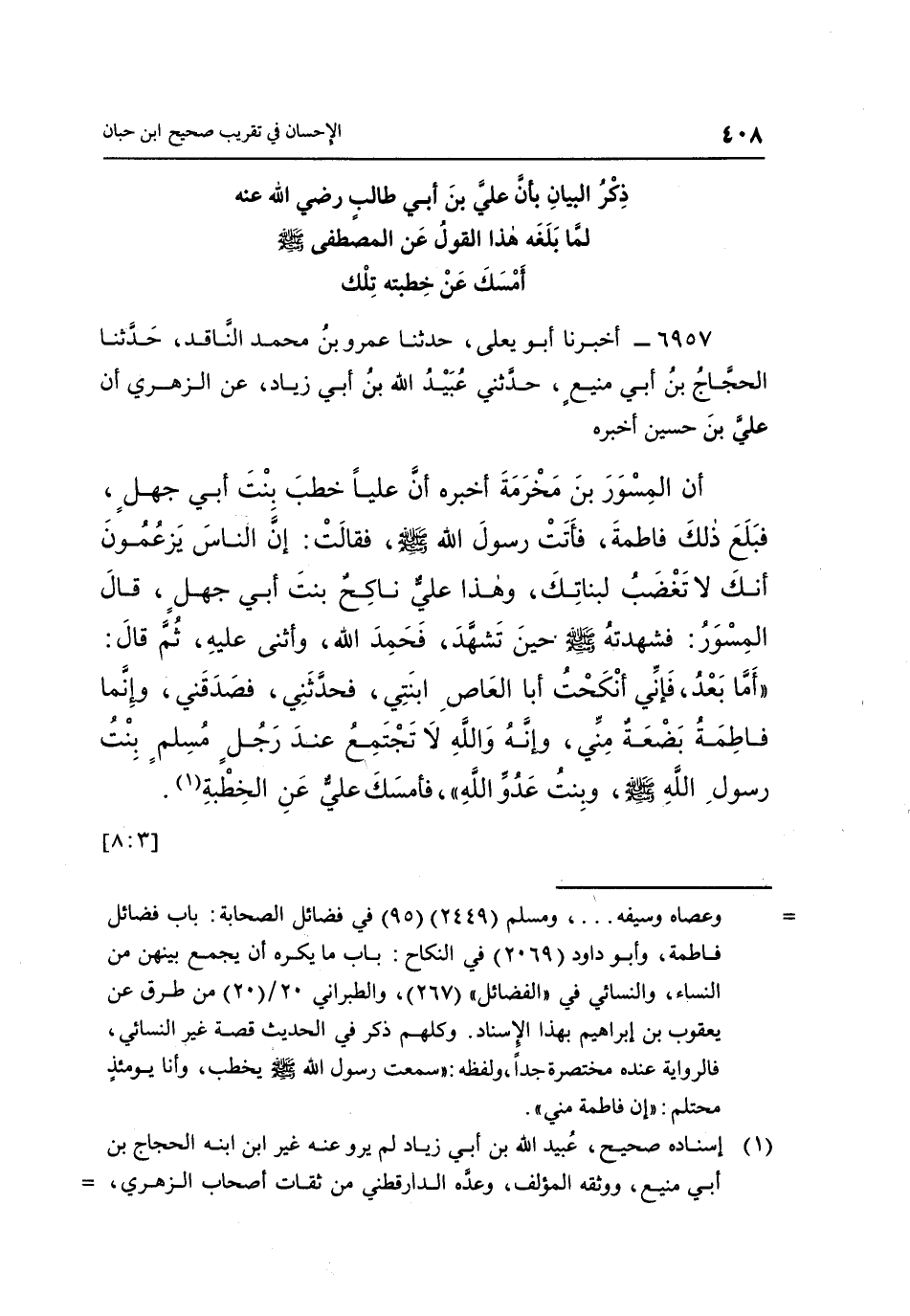ذِكْرُ الْبَيَانِ بِأَنَّ عَلِيُّ بْنُ أَبِي طَالِبٍ رَضِيَ اللَّهُ عَنْهُ لَمَّا بَلَغَهُ هَذَا الْقَوْلُ عَنِ الْمُصْطَفَى صَلَّى اللَّهُ عَلَيْهِ وَسَلَّمَ أَمْسَكَ عَنْ خِطْبَتِهِ تِلْكَ