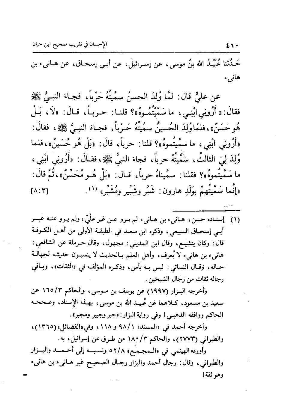 عَنْ عَلِيٍّ قَالَ: لَمَّا وُلِدَ الْحَسَنُ سَمَّيْتُهُ حَرْبًا، فَجَاءَ النَّبِيُّ صَلَّى اللَّهُ عَلَيْهِ وَسَلَّمَ فَقَالَ: "أَرُونِي ابْنِي، مَا سَمَّيْتُمُوهُ؟ " قُلْنَا: حَرْبًا، قَالَ: "لَا، بَلْ هُوَ حَسَنٌ" فَلَمَّا وُلِدَ الْحُسَيْنُ سَمَّيْتُهُ حَرْبًا، فَجَاءَ النَّبِيُّ صَلَّى اللَّهُ عَلَيْهِ وَسَلَّمَ فَقَالَ: "أَرُونِي ابْنِي، مَا سَمَّيْتُمُوهُ؟ " قُلْنَا: حَرْبًا، قَالَ: "بَلْ هُوَ حُسَيْنٌ" فَلَمَّا وُلِدَ لِي الثَّالِثُ، سَمَّيْتُهُ حَرْبًا، فَجَاءَ النَّبِيُّ صَلَّى اللَّهُ عَلَيْهِ وَسَلَّمَ فَقَالَ: "أَرُونِي ابْنِي، مَا سَمَّيْتُمُوهُ؟ " فَقُلْنَا: سَمَّيْنَاهُ حَرْبًا، قَالَ: "بَلْ هُوَ مُحْسِنٌ" ثُمَّ قَالَ: "إِنَّمَا سَمَّيْتُهُمْ بِوَلَدِ هارون شَبَّر وشَِبِّير ومُشَبِّر" "1". [3: 8]