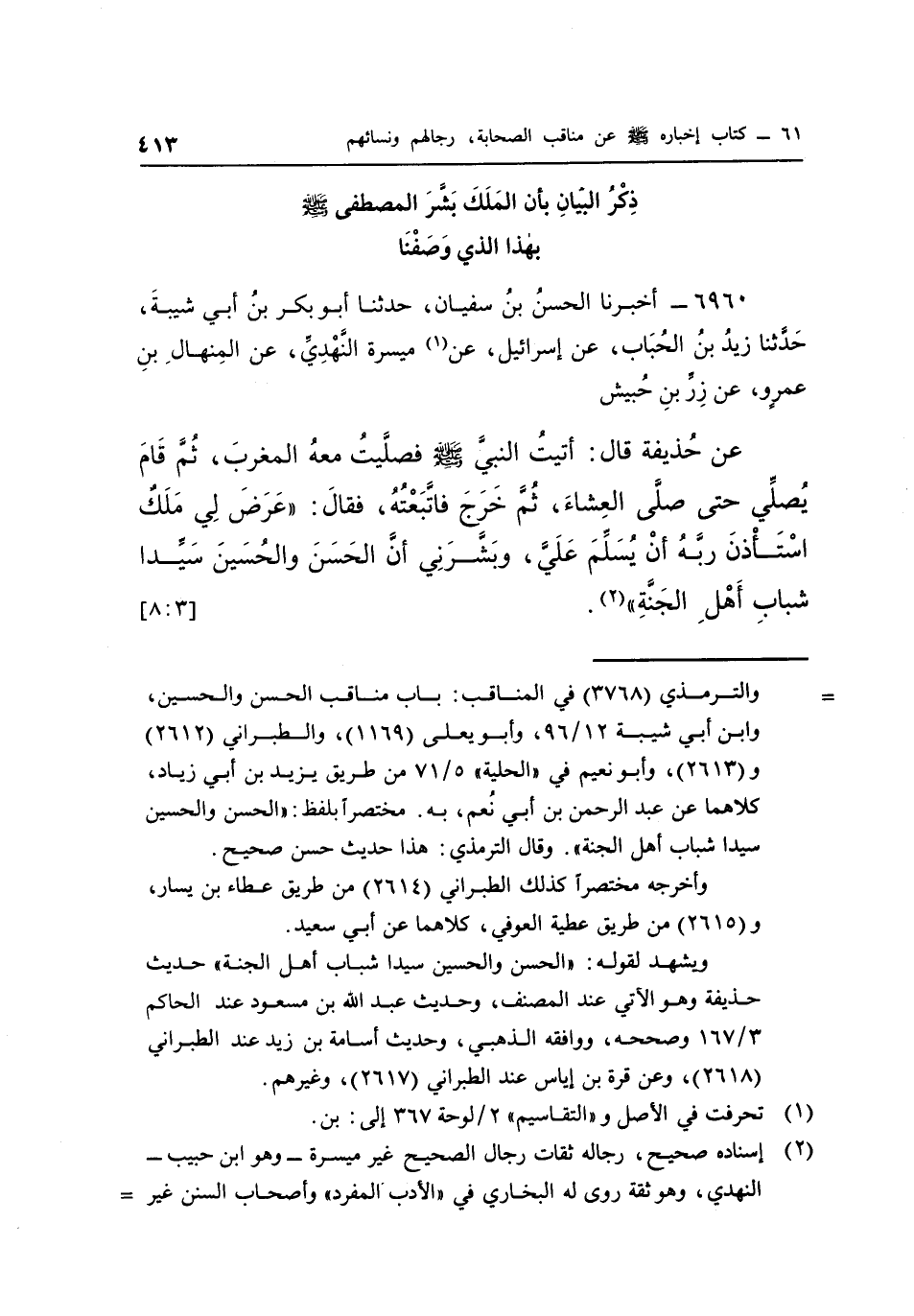 عَنْ حُذَيْفَةَ قَالَ: أَتَيْتُ النَّبِيَّ صَلَّى اللَّهُ عَلَيْهِ وَسَلَّمَ فَصَلَّيْتُ مَعَهُ الْمَغْرِبَ، ثُمَّ قَامَ يُصَلِّي حَتَّى صَلَّى الْعِشَاءَ، ثُمَّ خَرَجَ فَاتَّبَعْتُهُ، فَقَالَ: "عَرَضَ لِي مَلَكٌ اسْتَأْذَنَ رَبَّهُ أَنْ يُسَلِّمَ عَلَيَّ، وَبَشَّرَنِي أَنَّ الْحَسَنَ وَالْحُسَيْنَ سَيِّدَا شَبَابِ أَهْلِ الجنة" "2". [3: 8]