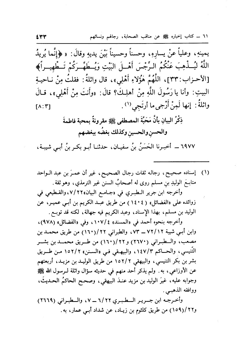 6977 - أَخْبَرَنَا الْحَسَنُ بْنُ سُفْيَانَ، حَدَّثَنَا أَبُو بَكْرِ بن أبي شيبة، ذكر البيان بأن محبة المصطفى مقرورنة بِمَحَبَّةِ فَاطِمَةَ وَالْحَسَنِ وَالْحُسَيْنِ وَكَذَلِكَ بُغْضِهِ بِبُغْضِهِمْ