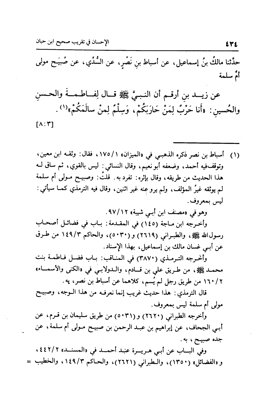 عَنْ زَيْدِ بْنِ أَرْقَمَ أَنَّ النَّبِيَّ صَلَّى اللَّهُ عَلَيْهِ وَسَلَّمَ قَالَ لِفَاطِمَةَ وَالْحَسَنِ وَالْحُسَيْنِ: "أَنَا حَرْبٌ لِمَنْ حَارَبَكُمْ، وَسَلْمٌ لِمَنْ سالمكم" " 1". [3: 8]