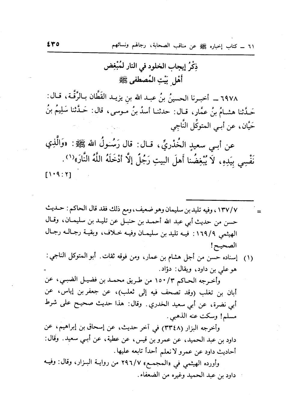 عَنْ أَبِي سَعِيدٍ الْخُدْرِيِّ، قَالَ: قَالَ رَسُولُ اللَّهِ صَلَّى اللَّهُ عَلَيْهِ وَسَلَّمَ: "وَالَّذِي نَفْسِي بِيَدِهِ، لَا يُبْغِضُنَا أَهْلَ الْبَيْتِ رَجُلٌ إِلَّا أَدْخَلَهُ الله النار" "1". [3: 109]