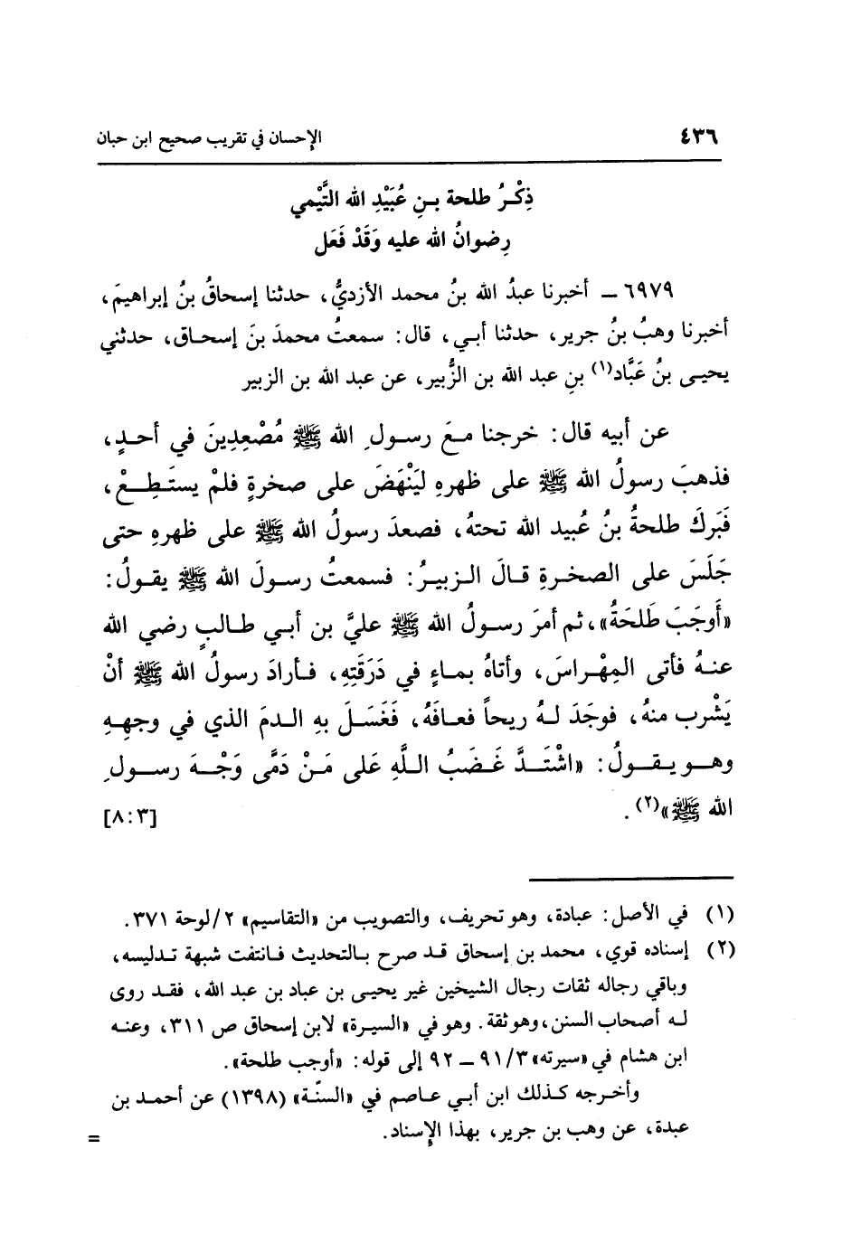 "2" إسناده قوي، محمد بن إسحاق قد صرح بالتحديث فانتفت شبهة تدليسه، وباقي رجاله ثقات رجال الشيخين غير يحيى بن عباد بن عبد الله، فقد روى له أصحاب السُّنن، وهو ثقة، وهو في "السيرة" لابن إسحاق ص 311، وعنه ابن هشام في "سيرته" 3/91 - 92 إلى قوله: "أوجب طلحة".
