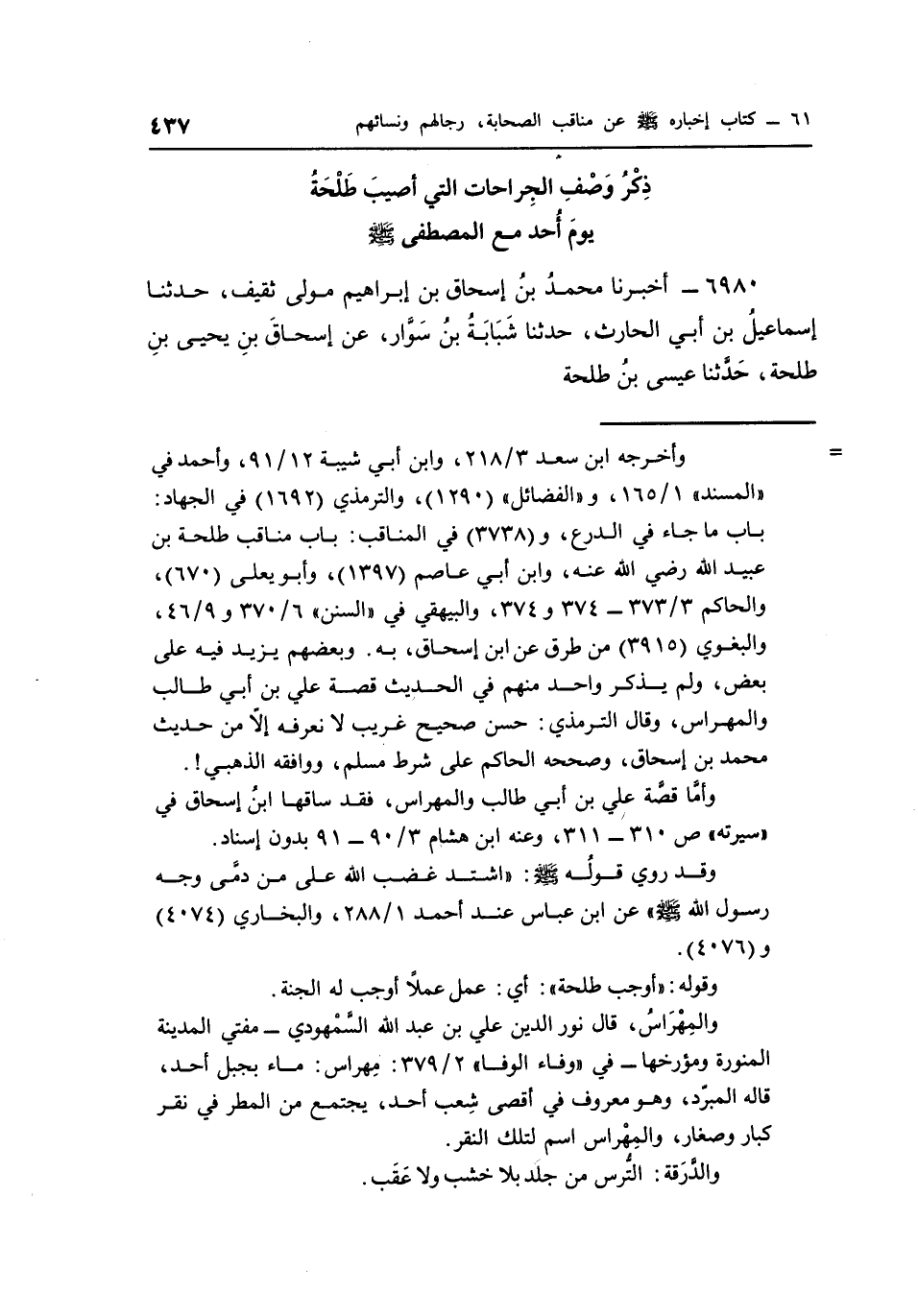 ذِكْرُ وَصْفِ الْجِرَاحَاتِ الَّتِي أُصِيبَ طَلْحَةُ يَوْمَ أُحُدٍ مَعَ الْمُصْطَفَى صَلَّى اللَّهُ عَلَيْهِ وَسَلَّمَ