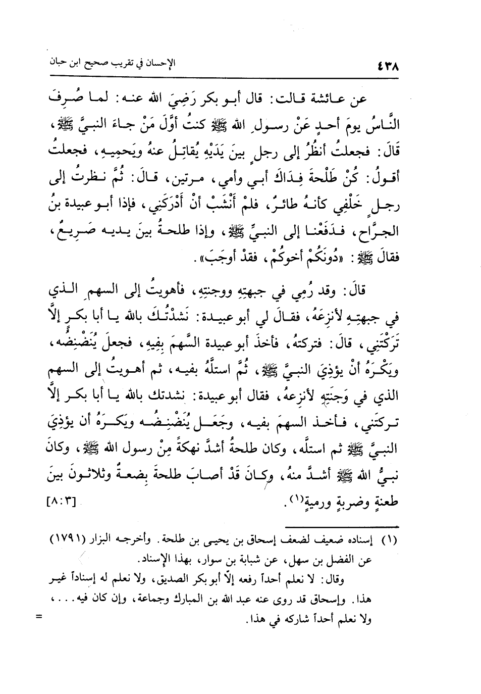 قَالَ: وَقَدْ رُمِيَ فِي جَبْهَتِهِ وَوَجْنَتِهِ، فَأَهْوَيْتُ إِلَى السَّهْمِ الَّذِي فِي جَبْهَتِهِ لِأَنْزِعَهُ، فَقَالَ لِي أَبُو عُبَيْدَةَ: نَشَدْتُكَ بِاللَّهِ يَا أَبَا بَكْرٍ إِلَّا تَرَكْتَنِي، قَالَ: فَتَرَكْتُهُ، فَأَخَذَ أَبُو عُبَيْدَةَ السَّهْمَ بِفِيهِ، فَجَعَلَ يُنَضْنِضُهُ، وَيَكْرَهُ أَنْ يُؤْذِيَ النَّبِيَّ صَلَّى اللَّهُ عَلَيْهِ وَسَلَّمَ، ثُمَّ اسْتَلَّهُ بِفِيهِ، ثُمَّ أَهْوَيْتُ إِلَى السَّهْمِ الَّذِي فِي وَجَنَتِهِ لِأَنْزِعَهُ، فَقَالَ أَبُو عبيدة: نشدتك بالله يا أبا بكر إلا تَرَكْتَنِي، فَأَخَذَ السَّهْمَ بِفِيهِ، وَجَعَلَ يُنَضْنِضُهُ وَيَكْرَهُ أَنْ يُؤْذِيَ النَّبِيَّ صَلَّى اللَّهُ عَلَيْهِ وَسَلَّمَ ثُمَّ اسْتَلَّهُ، وَكَانَ طَلْحَةُ أَشَدَّ نَهْكَةً مِنْ رَسُولِ اللَّهِ صَلَّى اللَّهُ عَلَيْهِ وَسَلَّمَ، وَكَانَ نَبِيُّ اللَّهِ صَلَّى اللَّهُ عَلَيْهِ وَسَلَّمَ أَشَدَّ منه، وكان قد أَصَابَ طَلْحَةَ بَضْعَةٌ وَثَلَاثُونَ بَيْنَ طَعْنَةٍ وَضَرْبَةٍ ورمية "1". [3: 8]